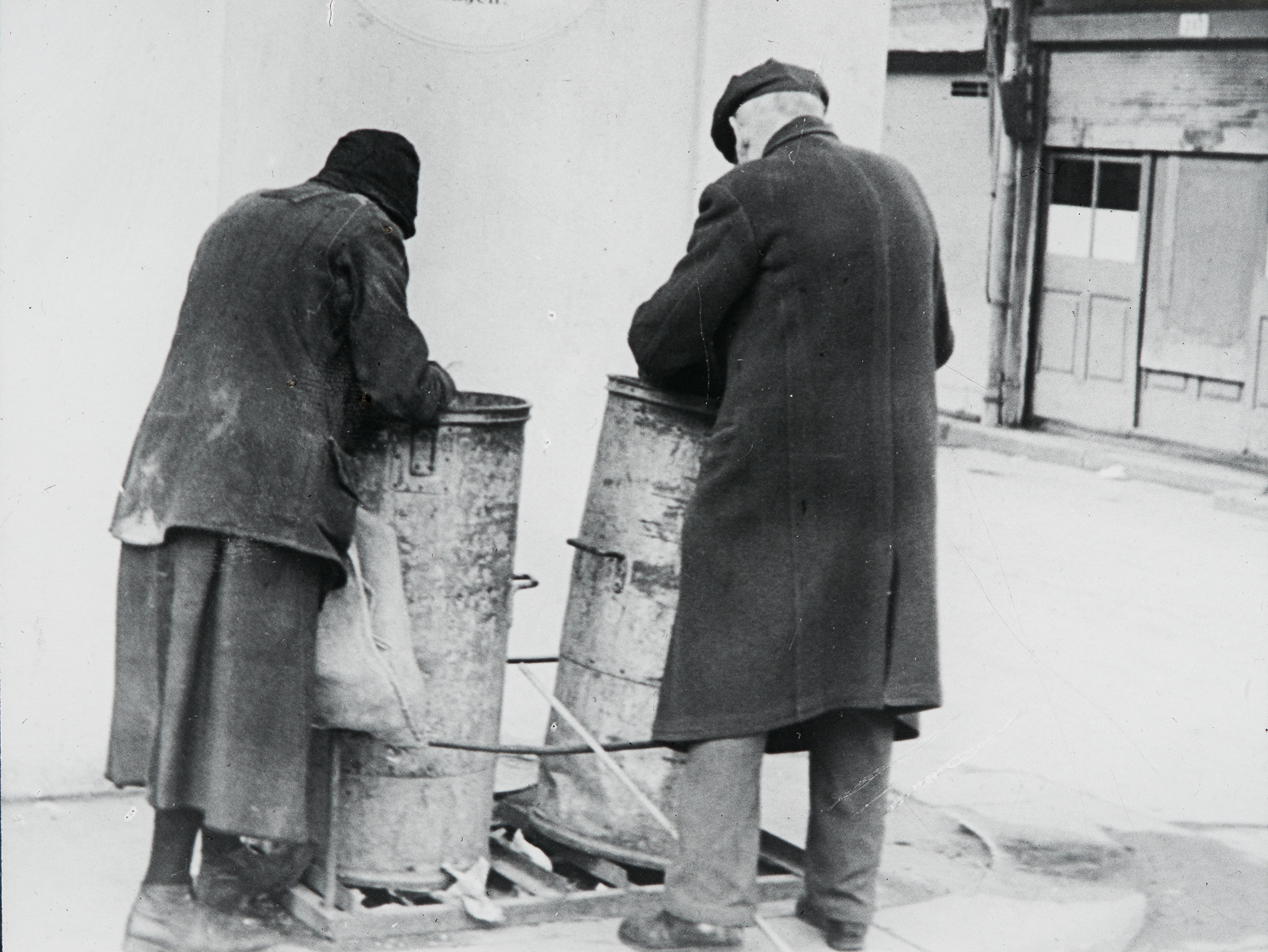 Diese beiden Menschen stehen, mit dem Rücken zur Kamera gewandt, vor zwei großen Tonnen.