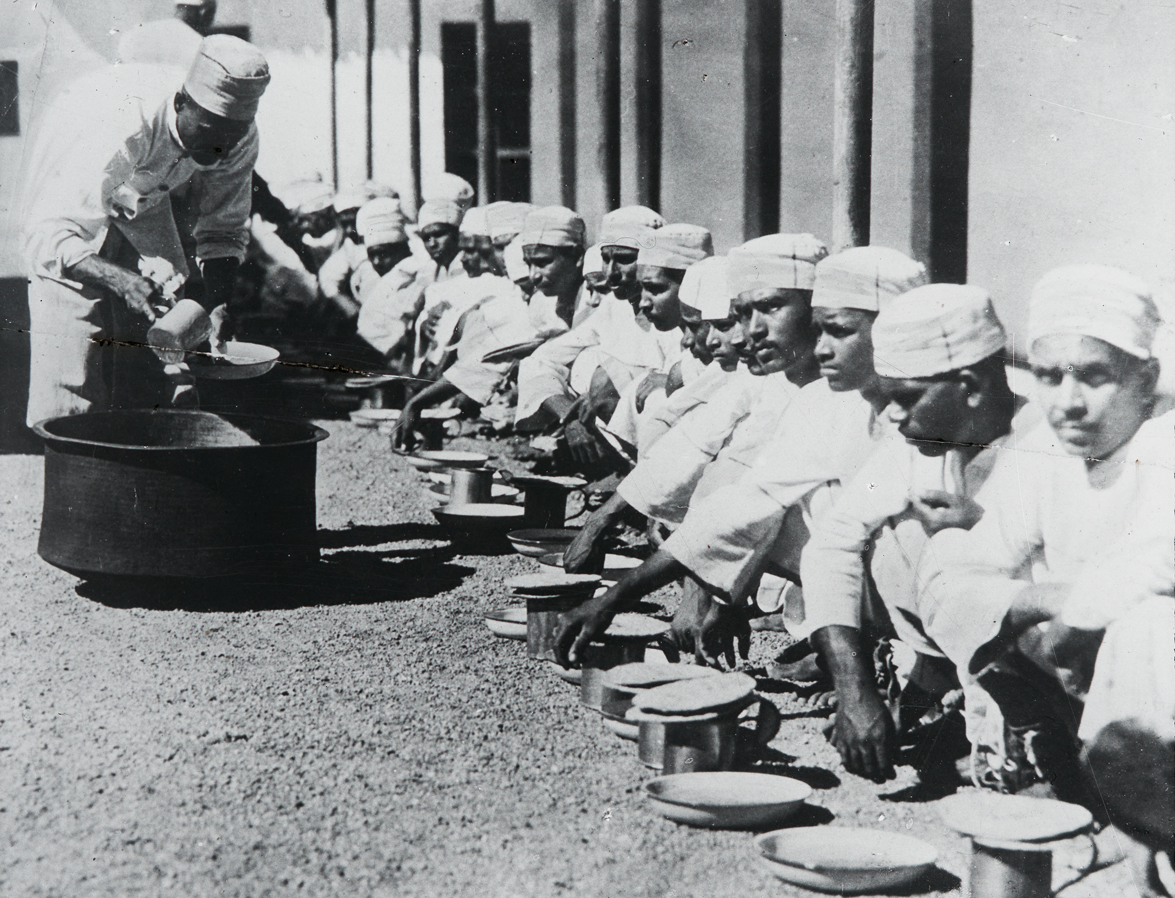 Hier hat sich eine Linie an Menschen gebildet, welche auf die Essensausgabe warten.