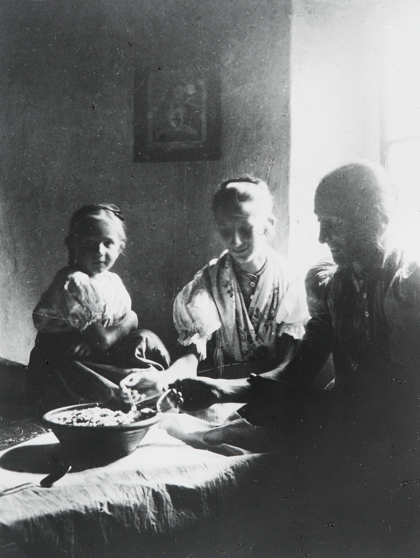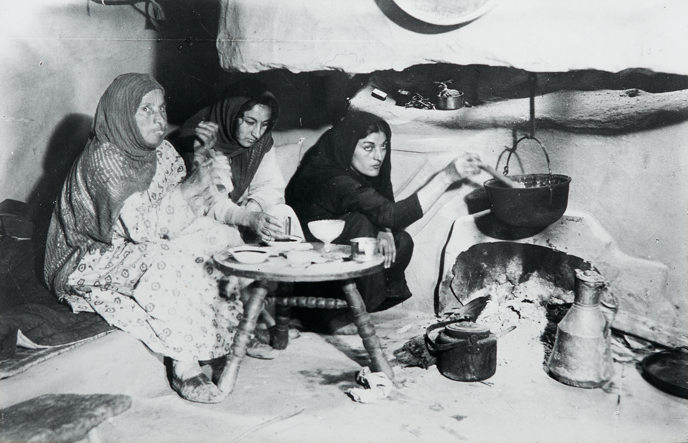 Diese Frauen, die dem Volk der Tscherkessen zugehören, sitzen beim Herd und essen.