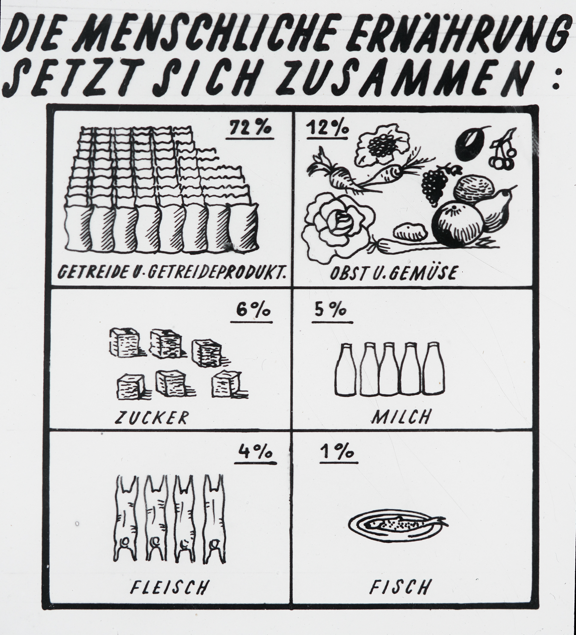 Ein Informationsblatt zur menschlichen Ernährung: "Die menschliche Ernährung setzt sich zusammen: 72% Getreide u. Getreideprodukt, 12% Obst u. Gemüse, 6% Zucker, 5% Milch, 4% Fleisch, 1% Fisch".