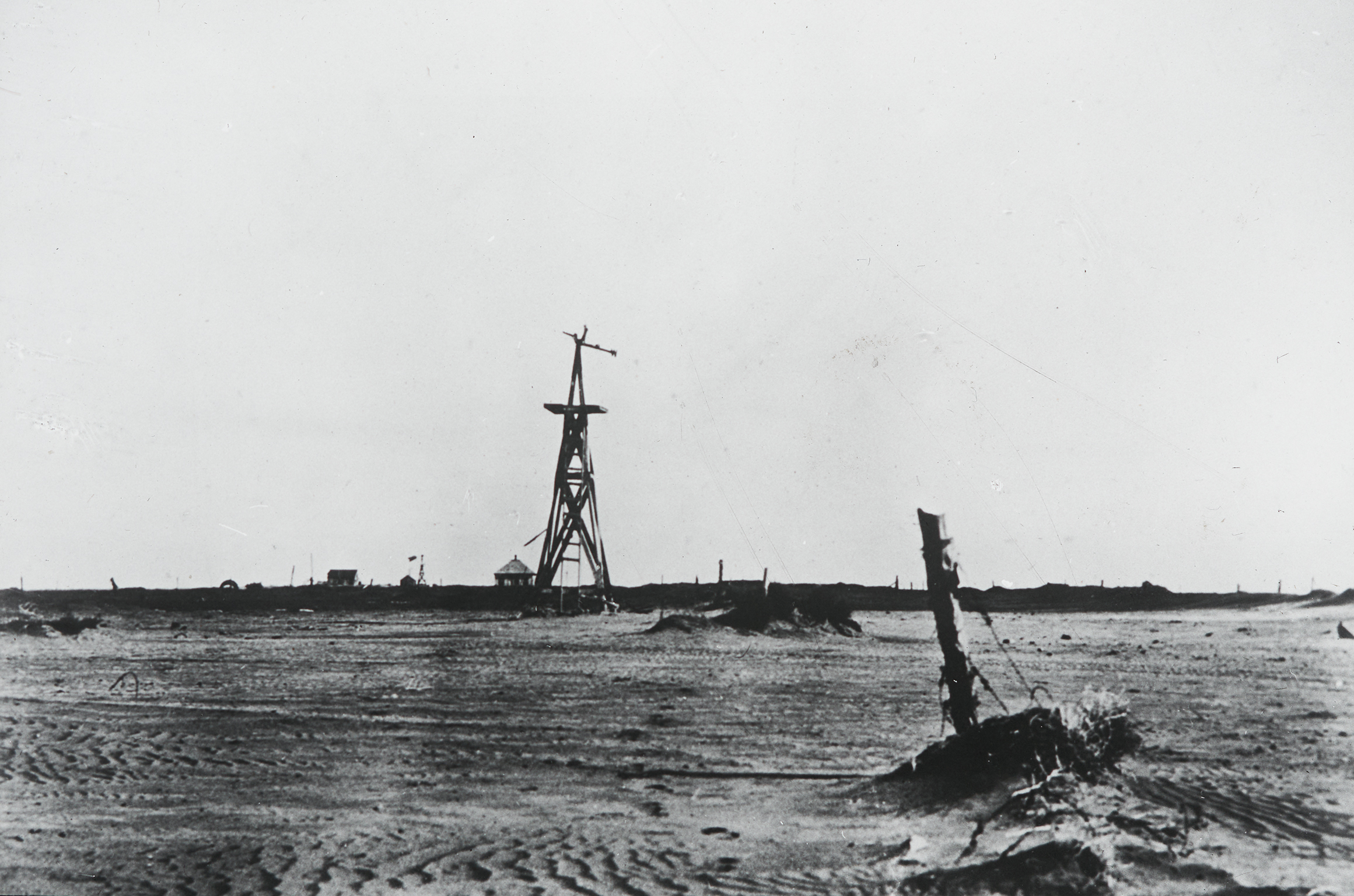 Zu sehen ist eine sandige Landschaft, in der vereinzelt Gebäude stehen.