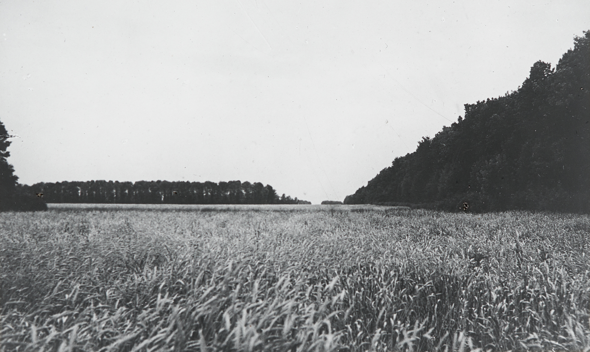 Der Ausblick über ein Getreidefeld. Links und rechts davon sind Wälder.