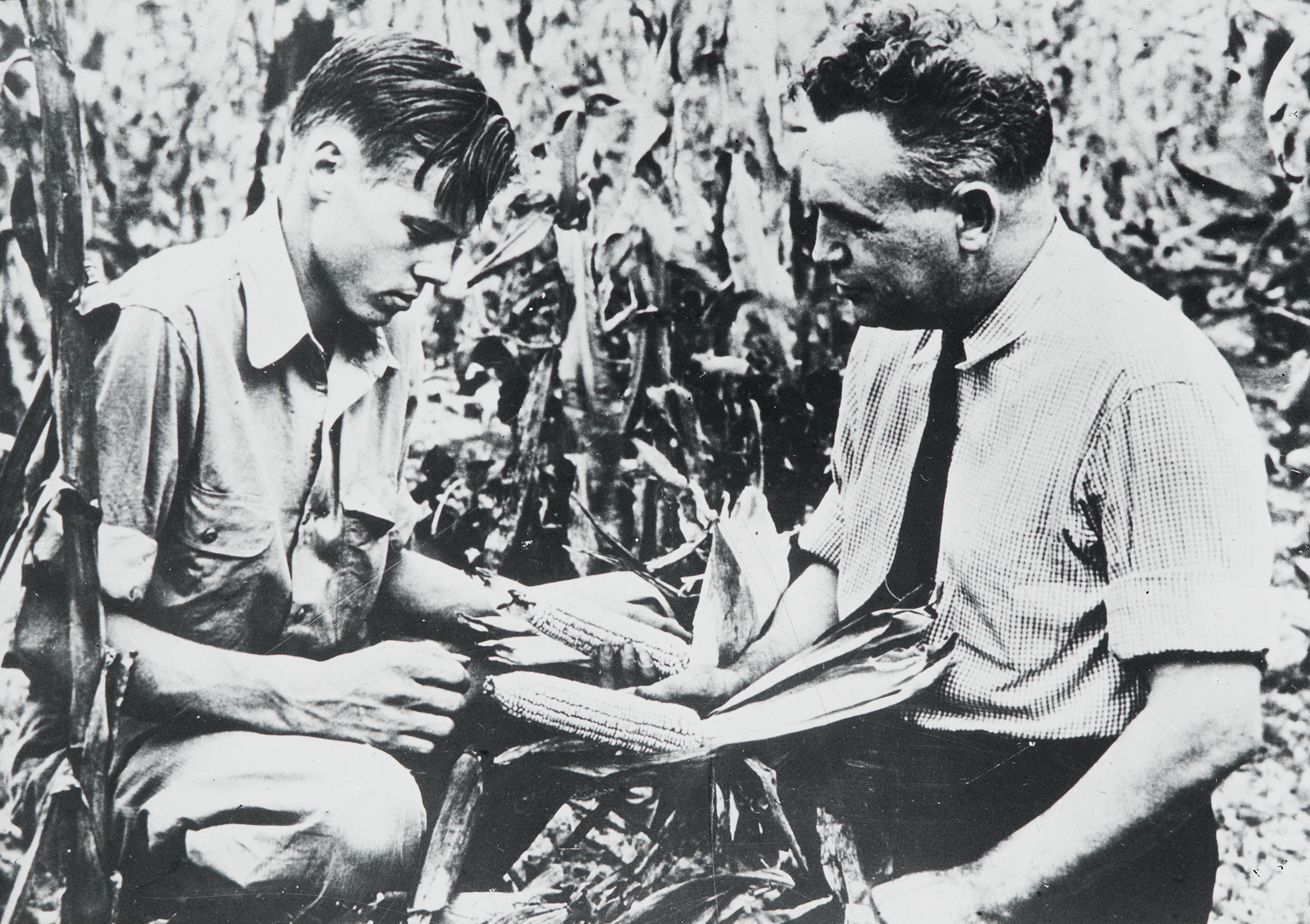 Diese beiden Männer befinden sich in einem Maisfeld. Sie kümmern sich vermutlich um die bevorstehende Ernte.