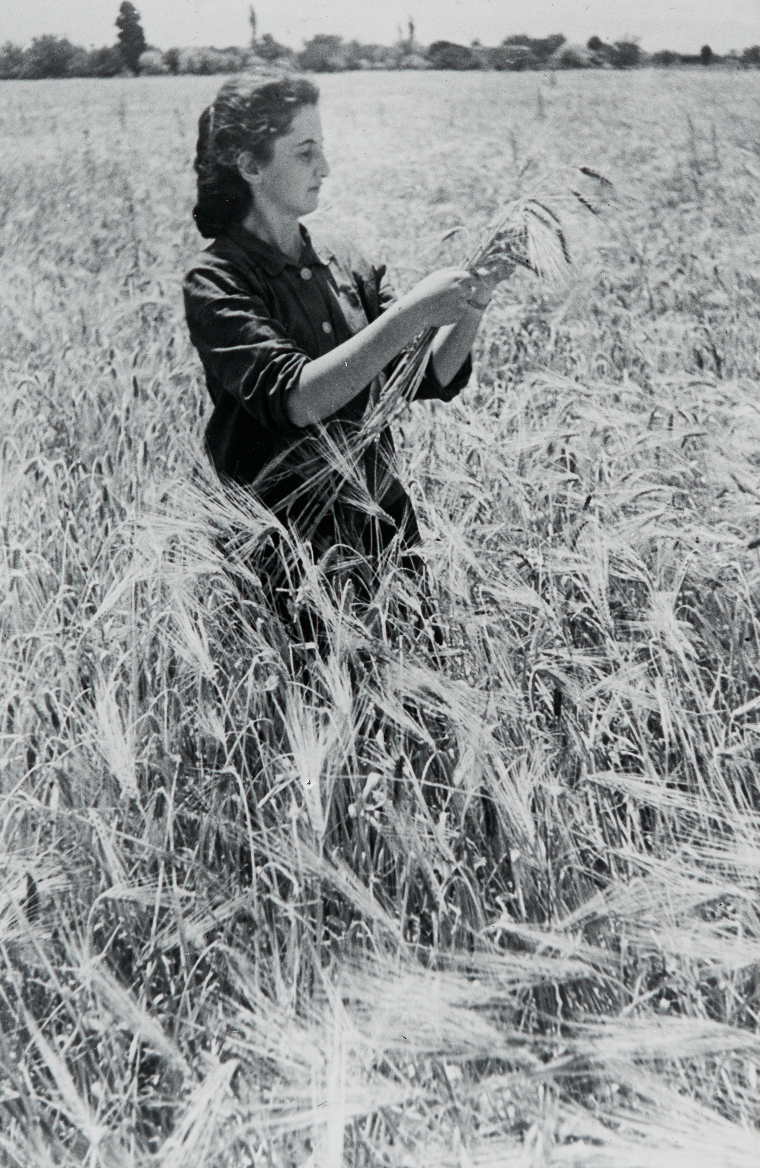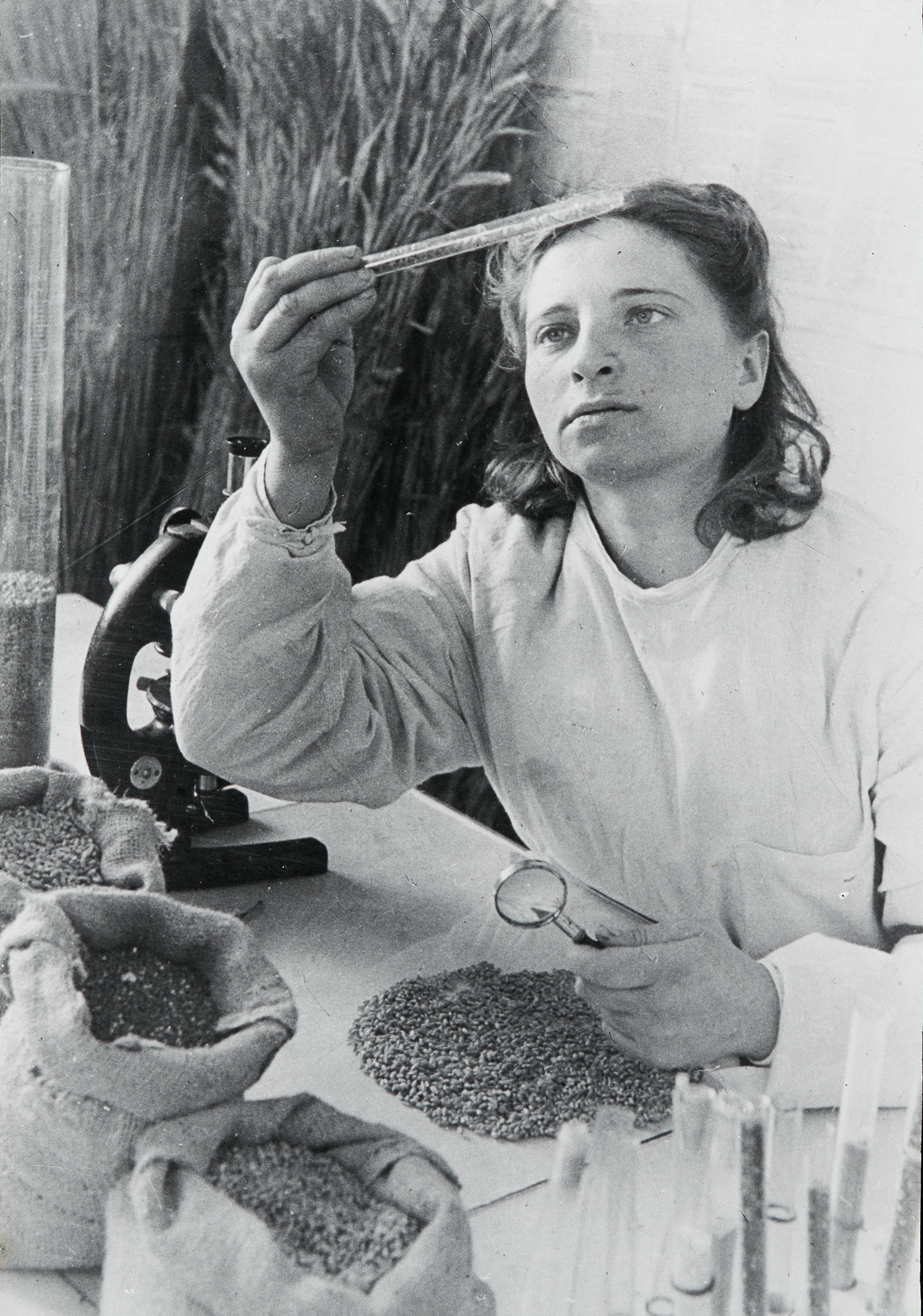 Diese Frau untersucht verschiedene Körner mit einer Lupe.