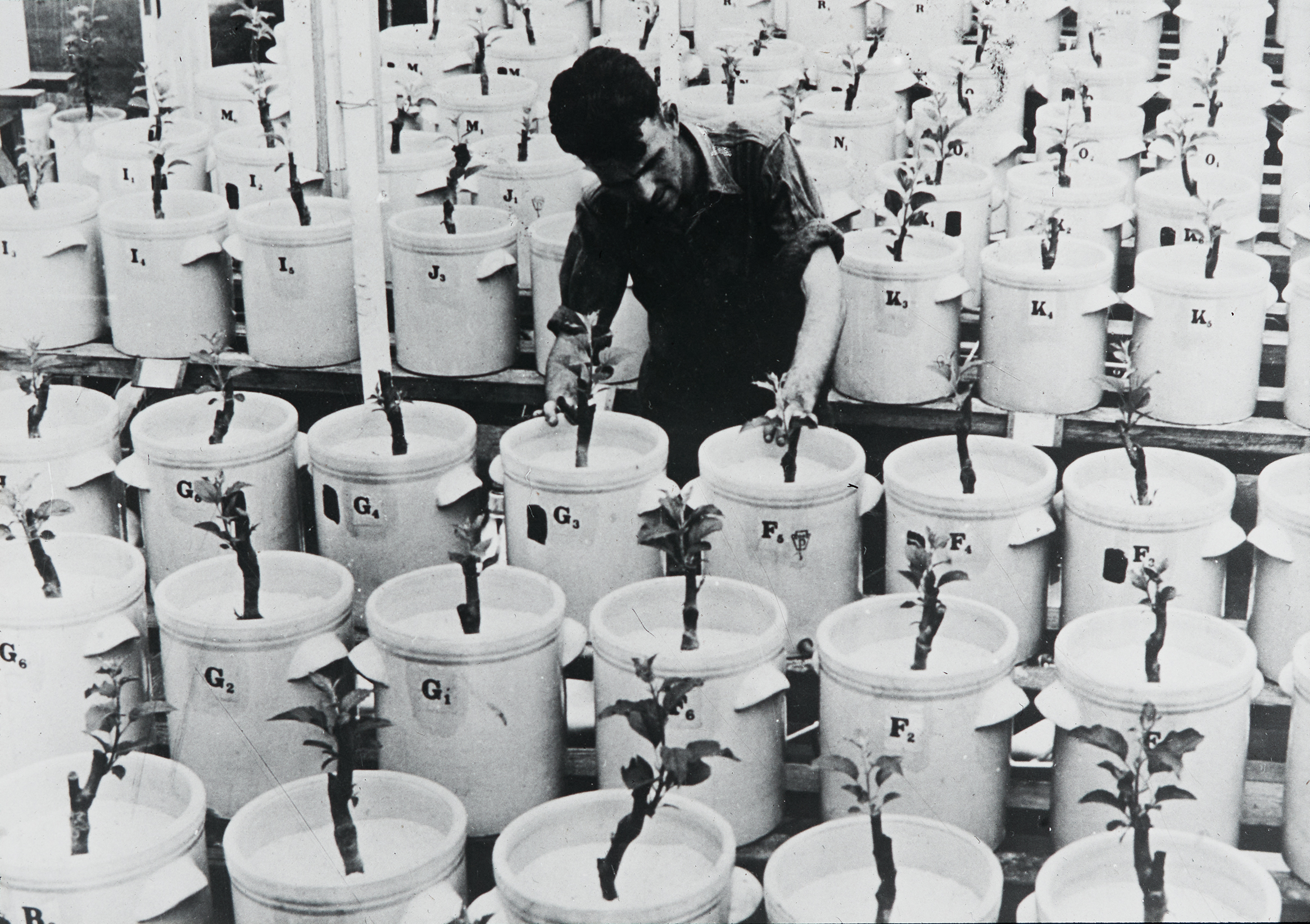 Dieser Mann kümmert sich um die Pflanzen in einer Plantage. Die Töpfe sind mit unterschiedlichen Buchstaben und Ziffern beschriftet.