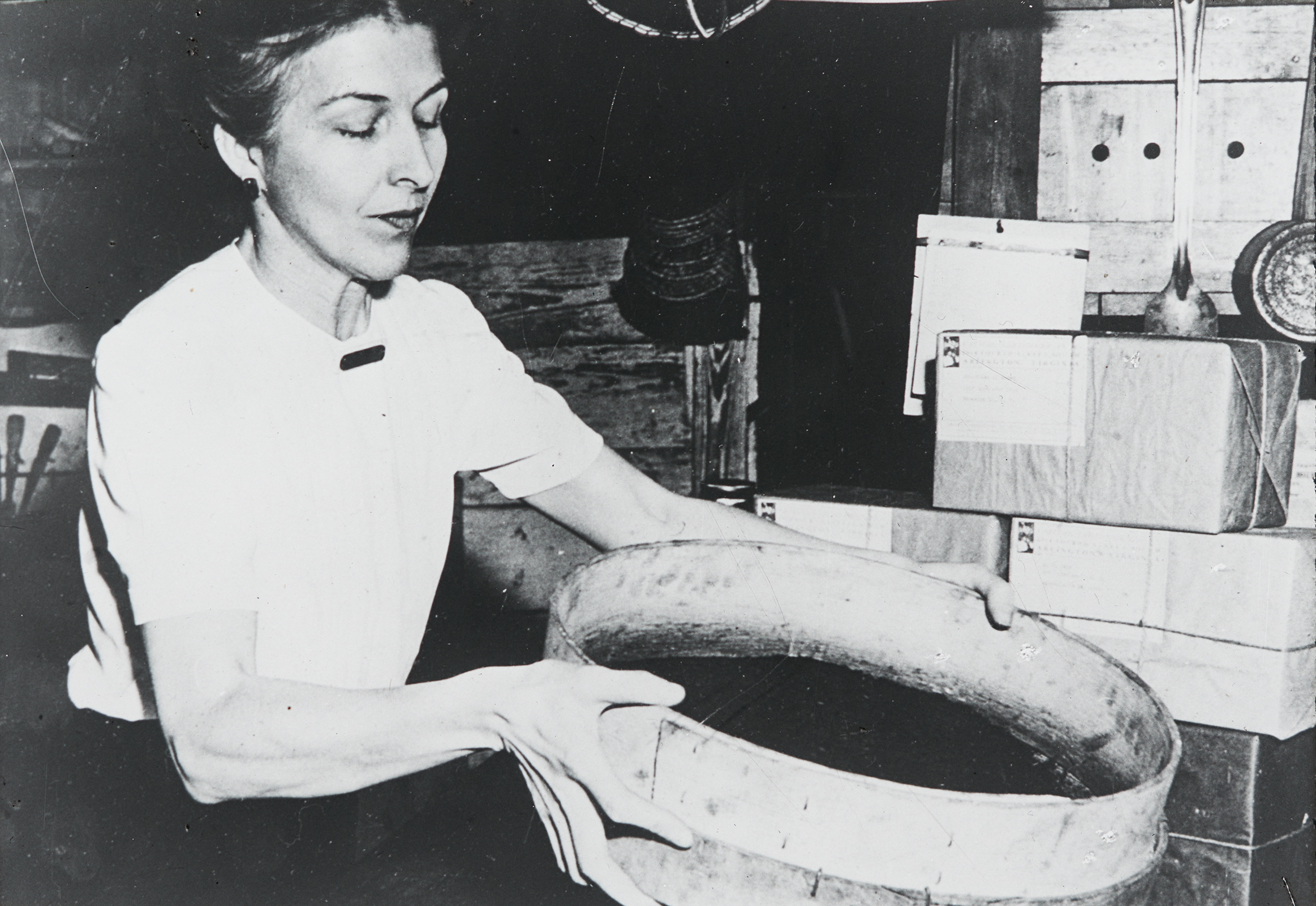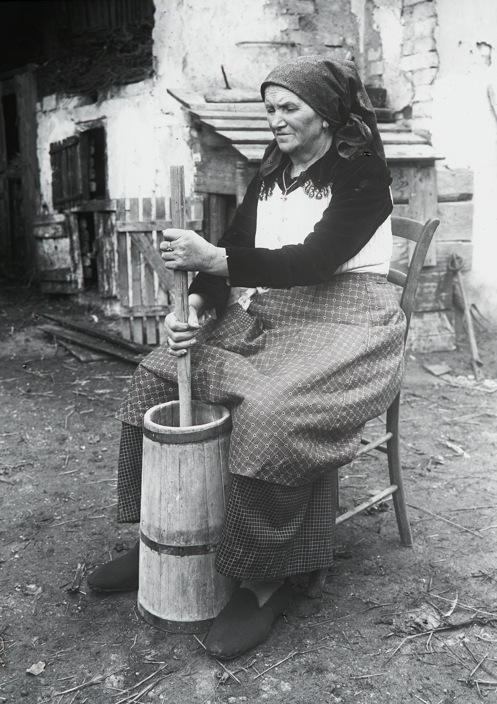 Zur Herstellung von Butter verwendet diese Frau ein Butterfass, in welches sie mit einem Holzstab stößt, um Butter zu schlagen.