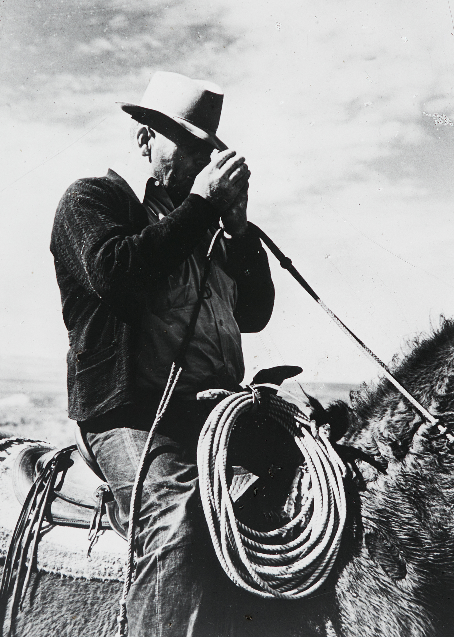 Dieser Mann reitet auf einem Pferd. Er führt ein Seil mit sich.