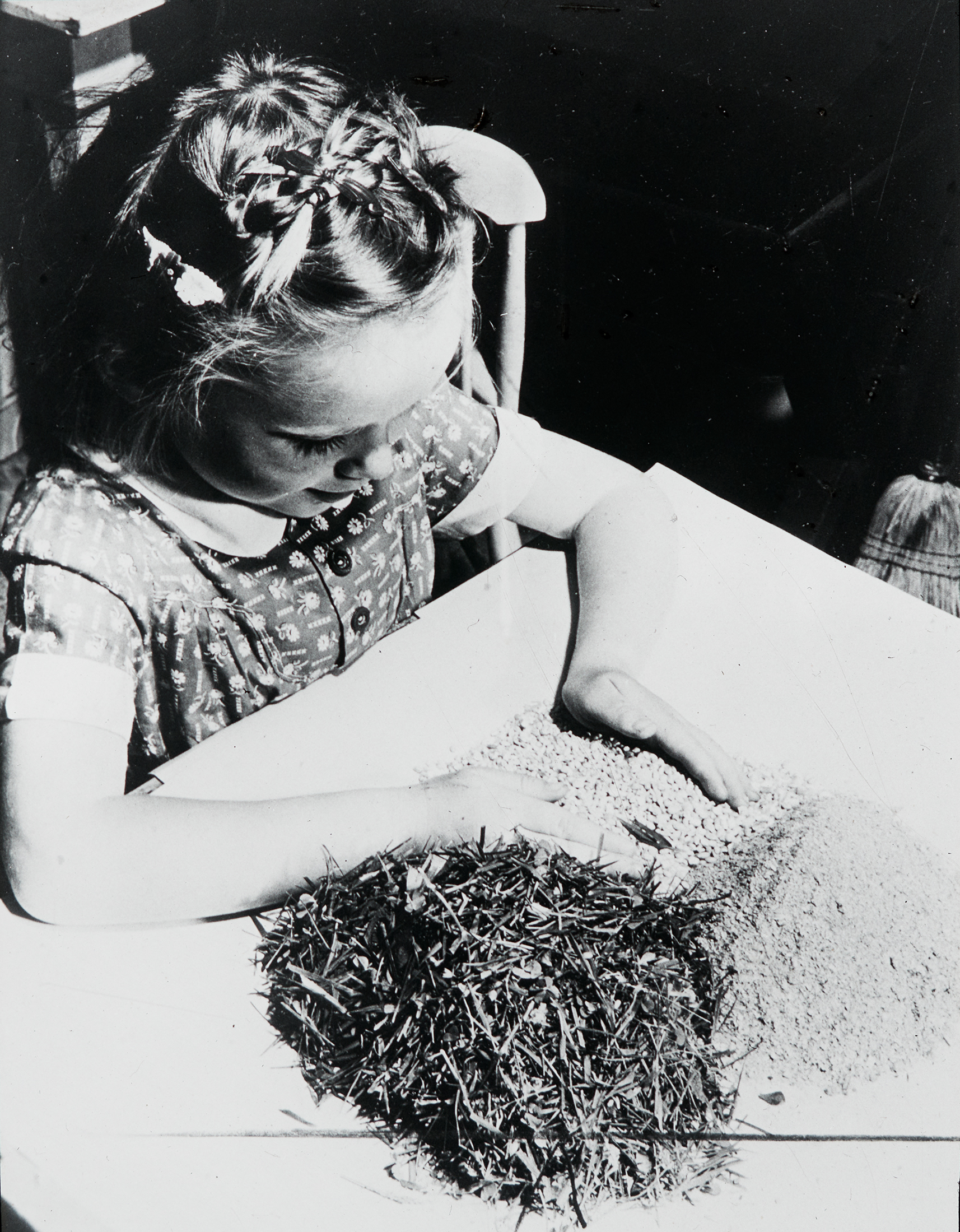 Vor diesem Kind liegen mehrere Haufen unterschiedlicher Dinge am Tisch.