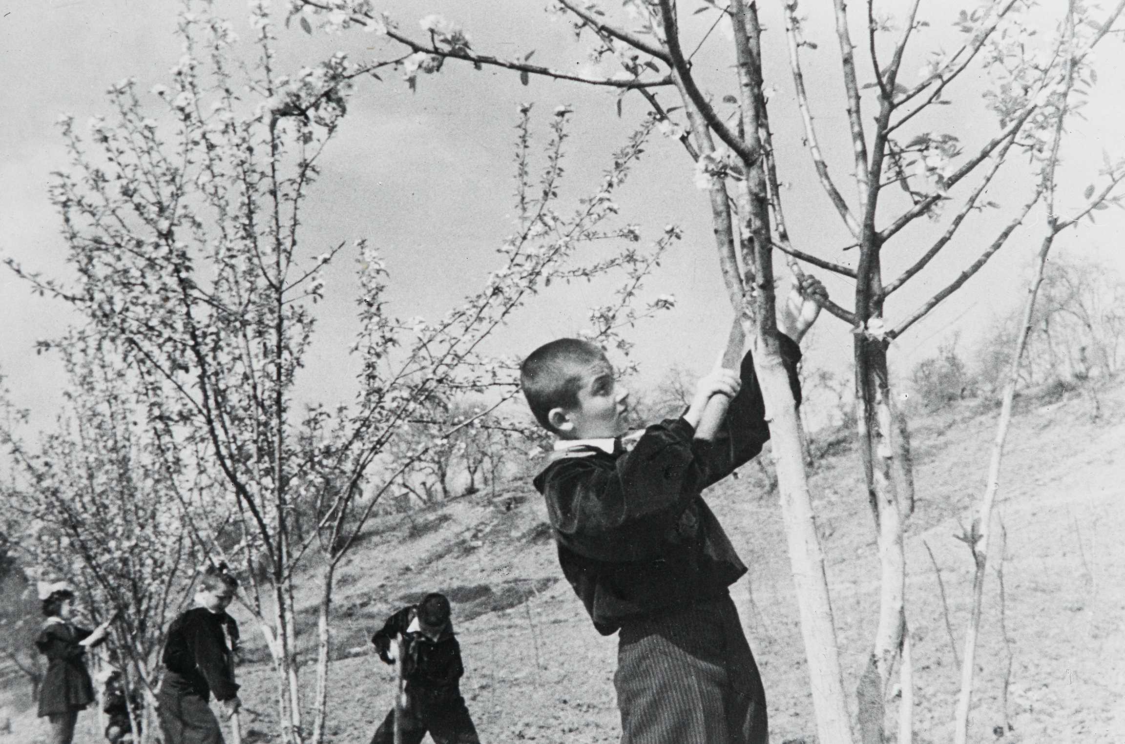 Diese Kinder beschäftigen sich mit den Bäumen.