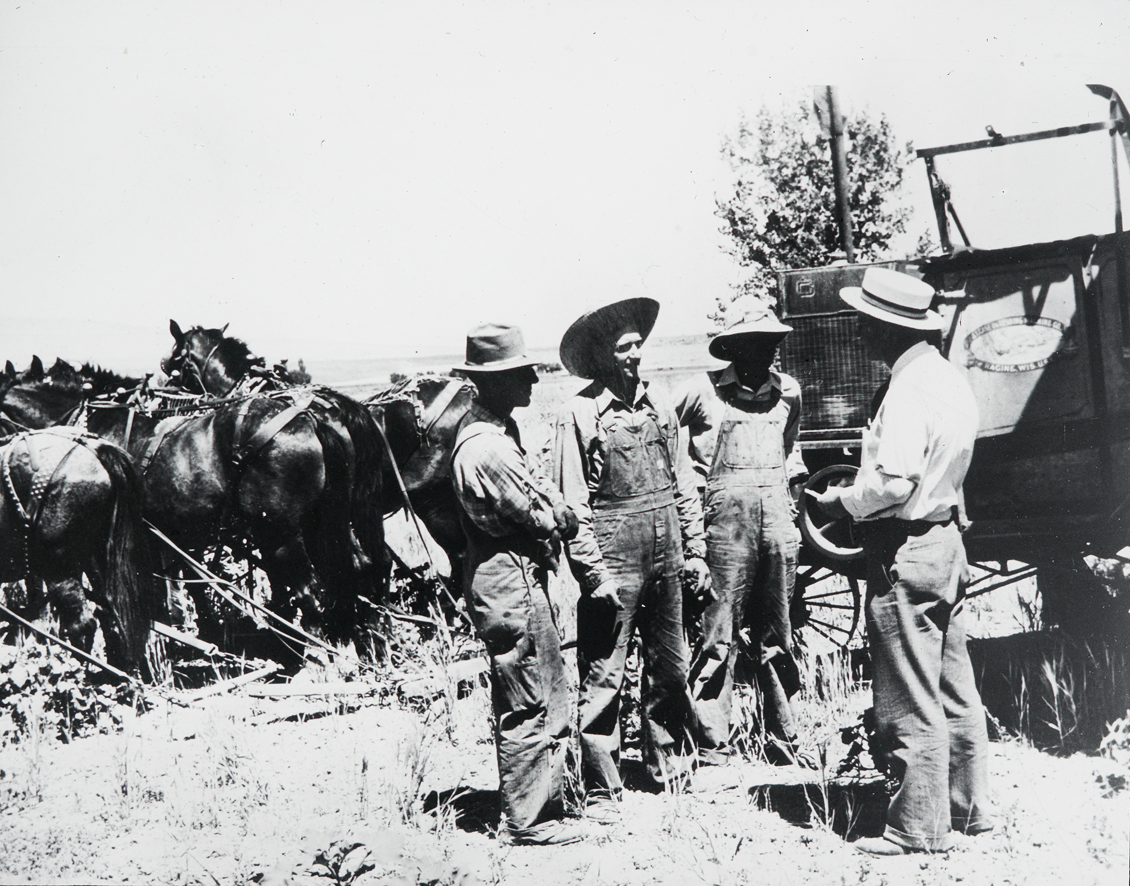 Diese vier Bauern unterhalten sich miteinander. Hinter ihnen sind Pferde aufgereiht, die vermutlich zur Bewirtschaftung der Landwirtschaft dienen.