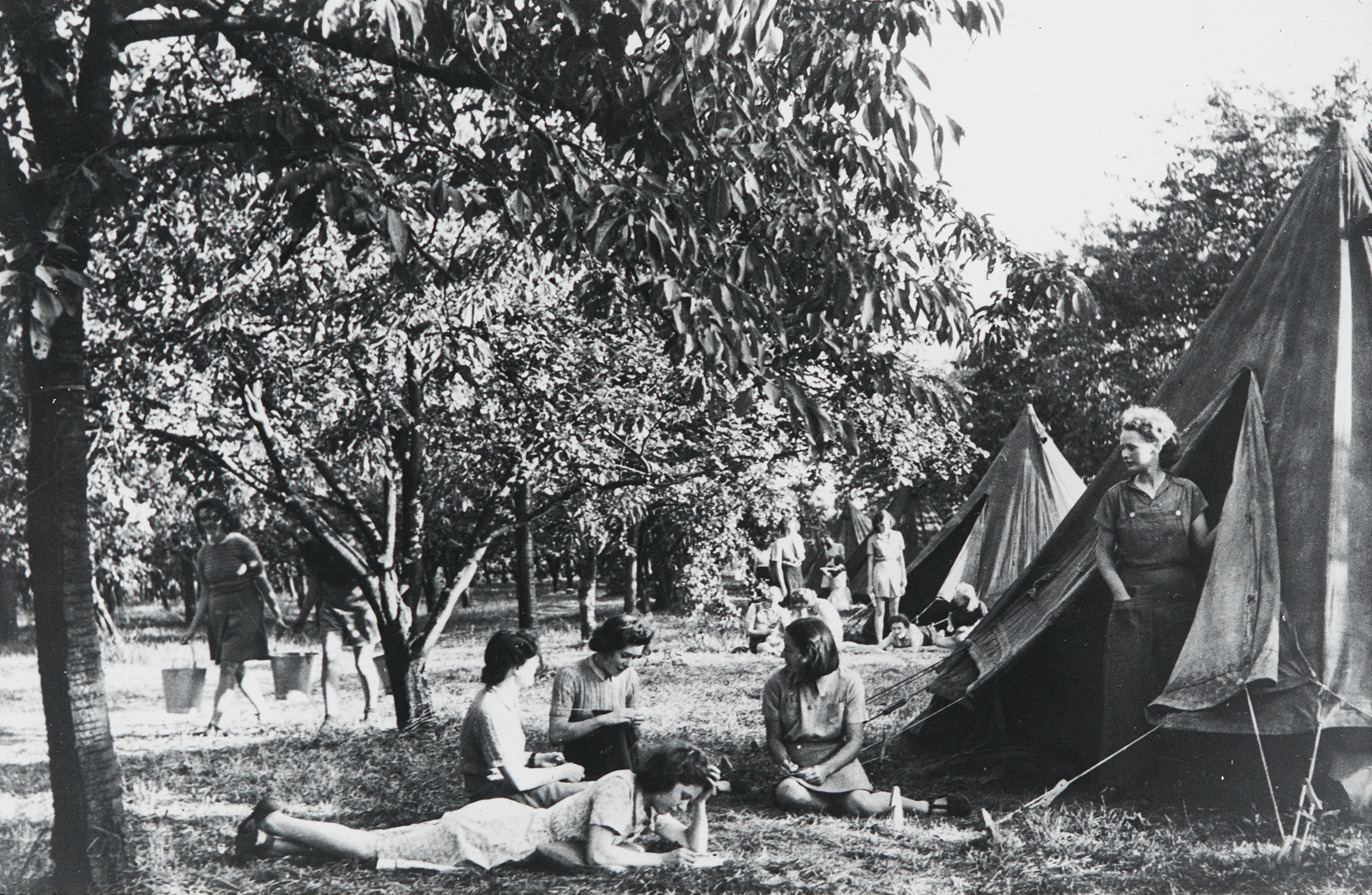 Auf dieser Wiese haben mehrere Frauen ein Zeltlager gebildet.