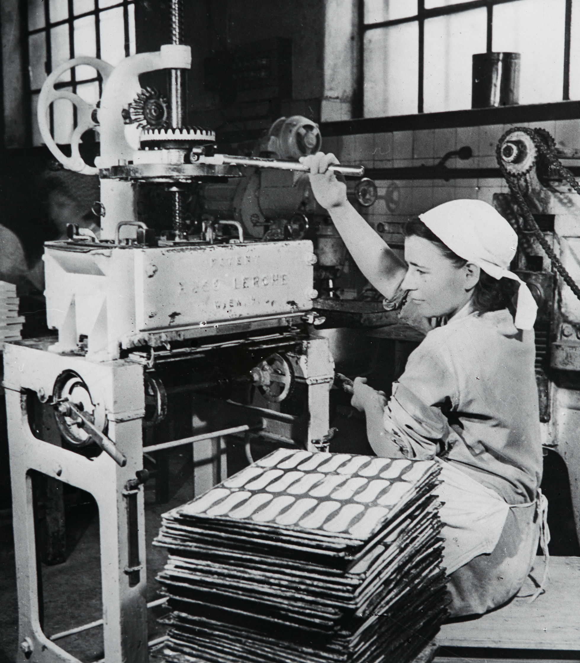 Diese Frau verrichtet ihre Arbeit an einer Maschine.