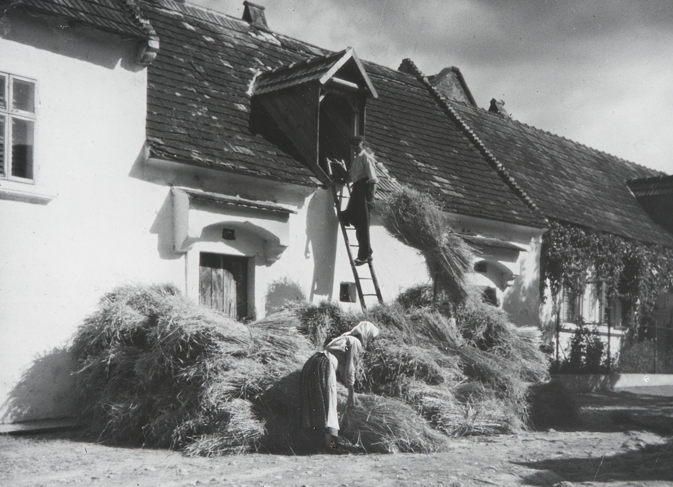 Während ein Mann auf einer Leiter steht, die in den oberen Stock dieser Scheune führt, sortiert eine Frau Bündel mit Heu.
