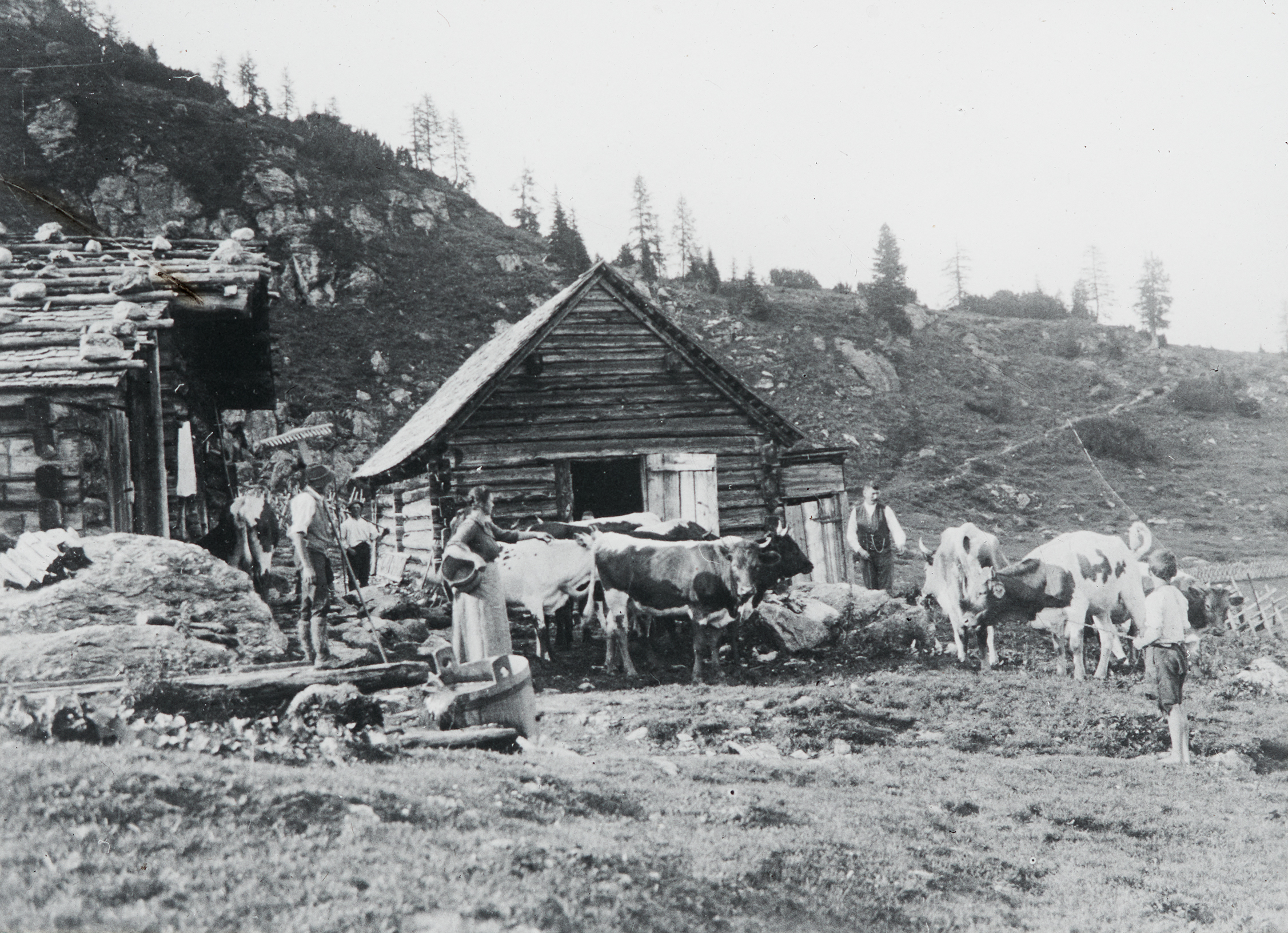 Vor dieser Holzhütte grast eine kleine Kuhherde.