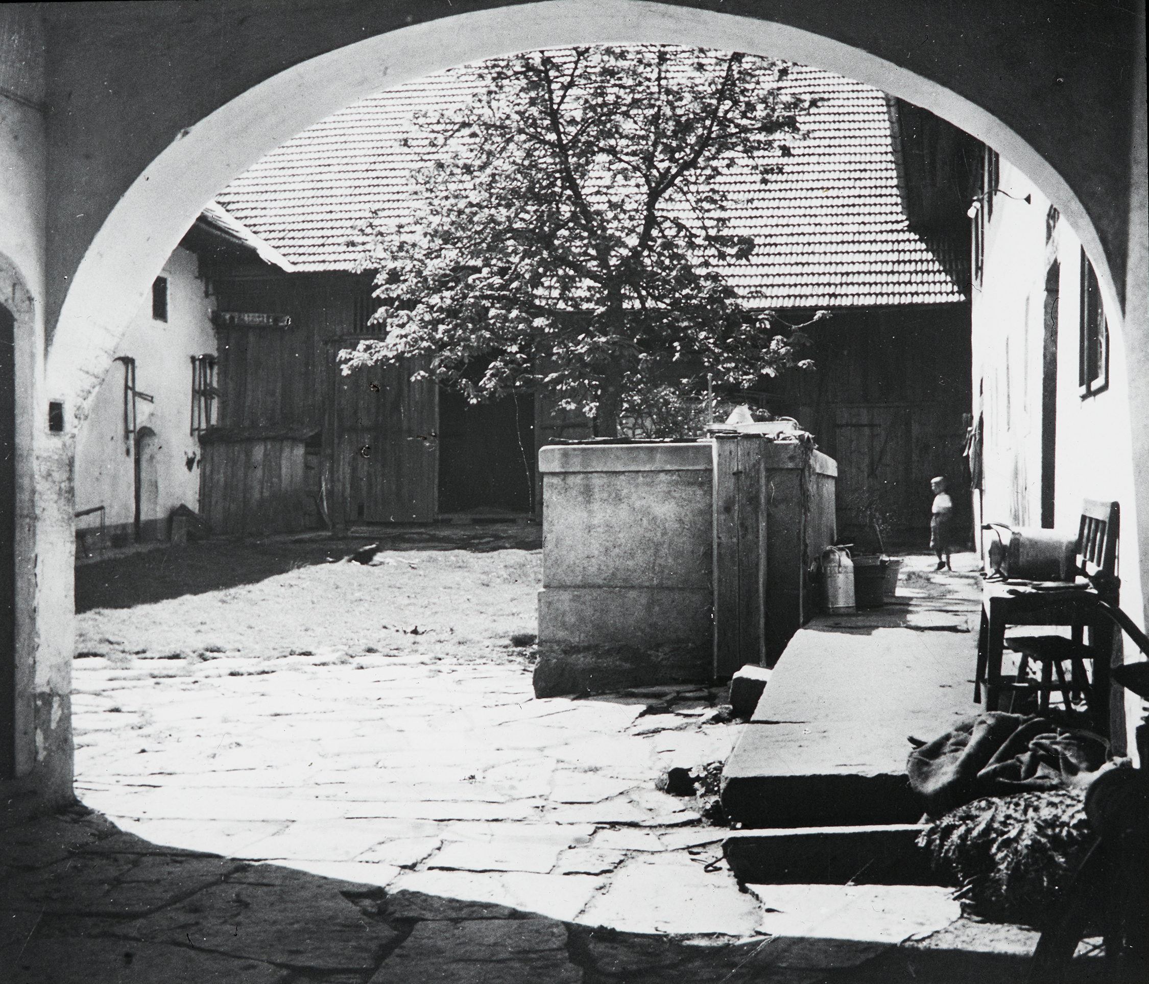 Im Innenhof dieses vierkantigen Bauernhofs wächst ein Baum.