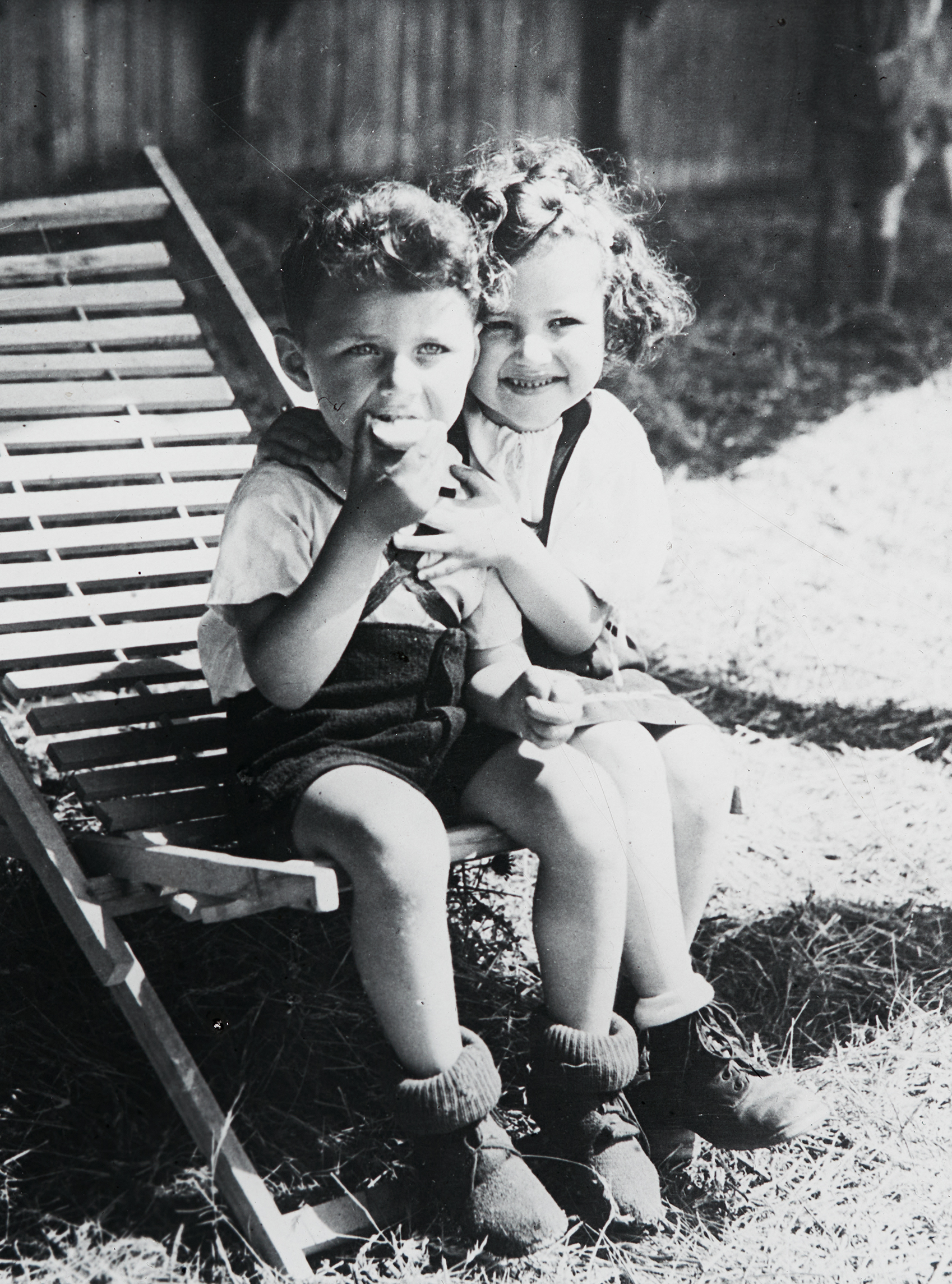 Diese beiden Kinder sitzen nebeneinander auf einem Holzstuhl. Das Kind zur Linken beißt gerade vom Essen ab.