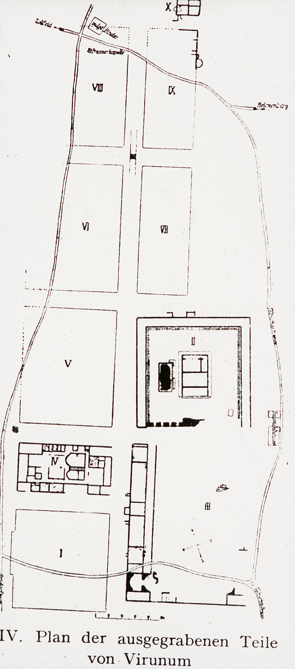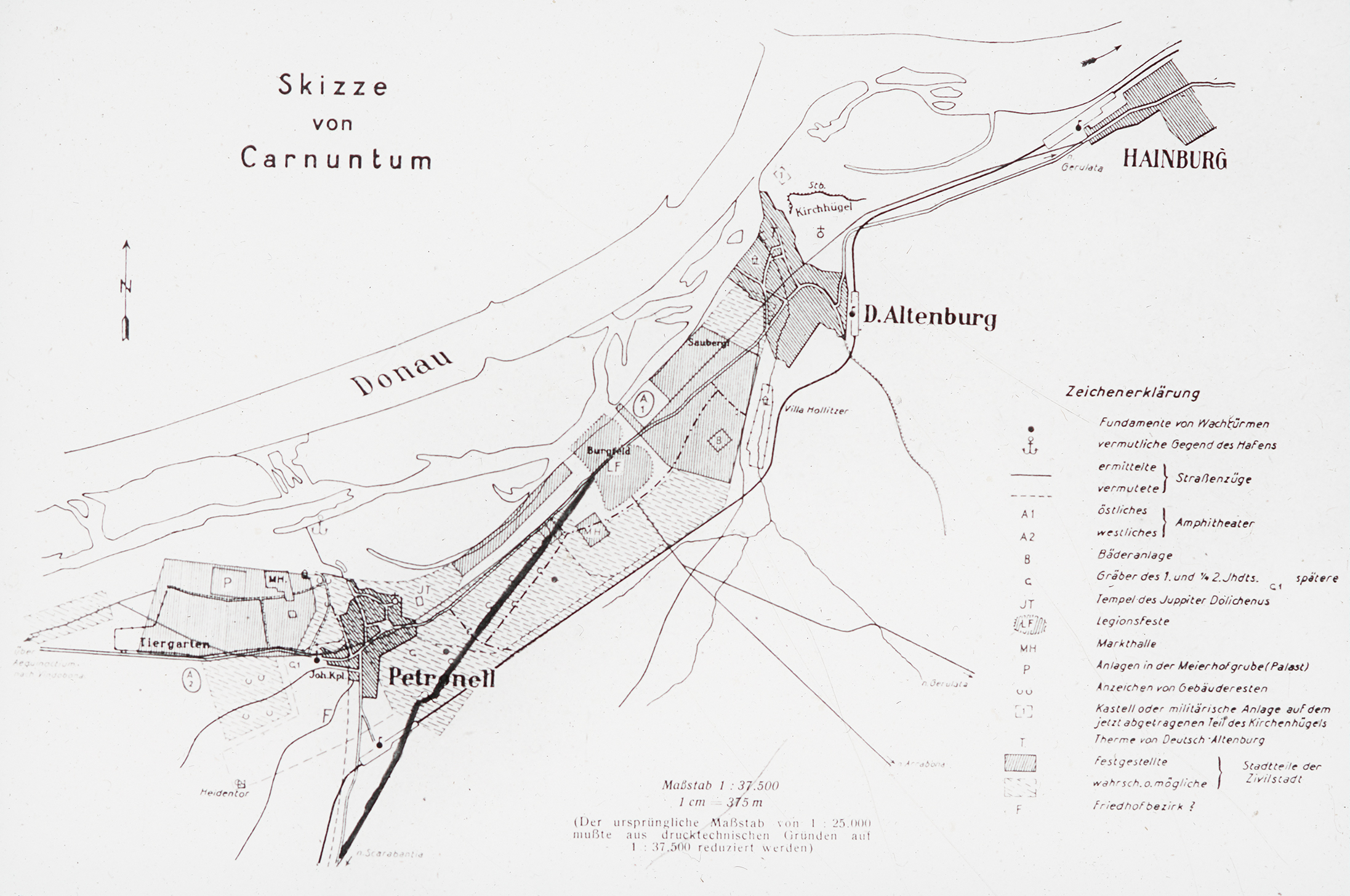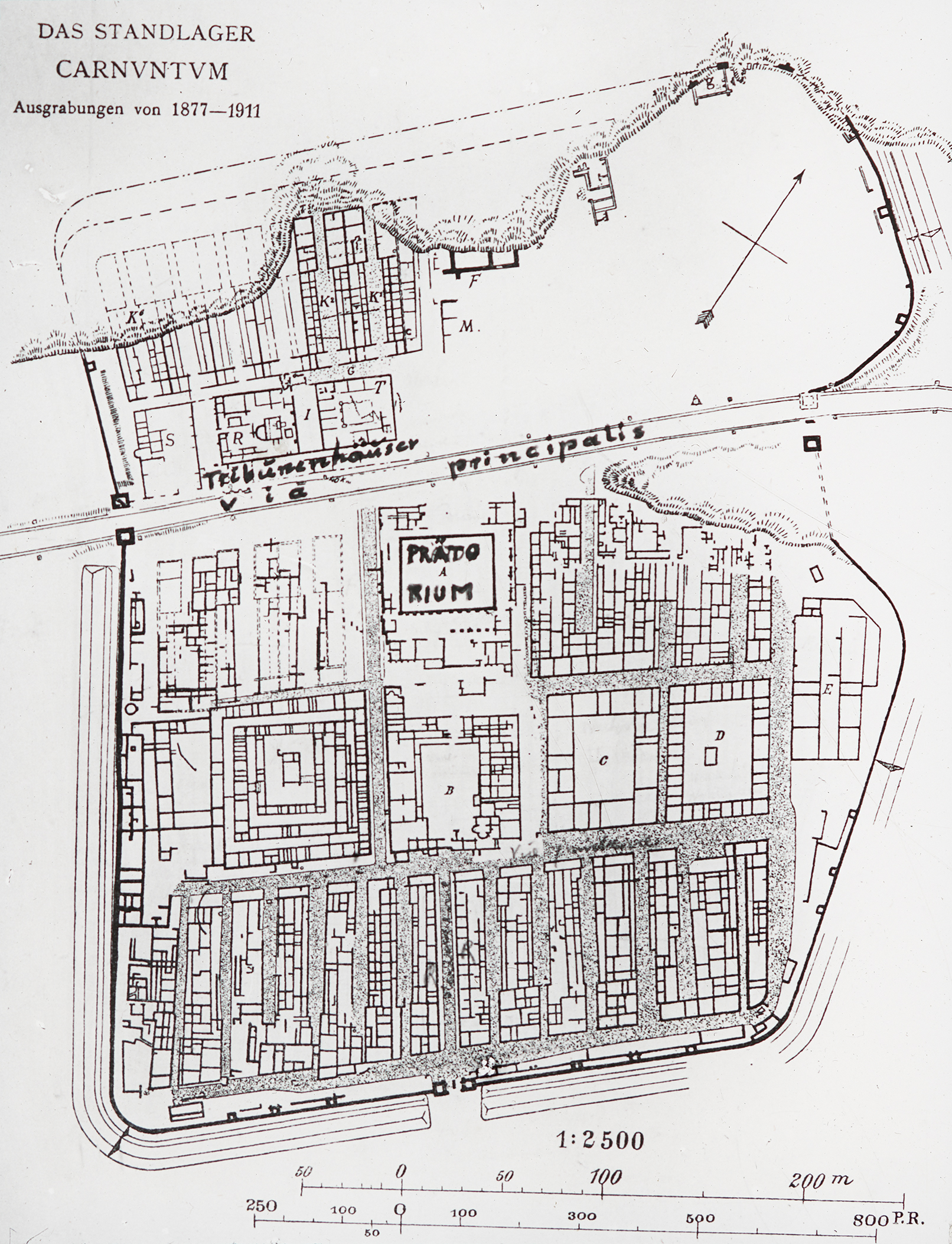 Diese Zeichnung zeigt das Legionslager Carnuntum. Sämtliche Funde von Ausgrabungen aus den Jahren 1877 bis 1911 sind eingezeichnet.