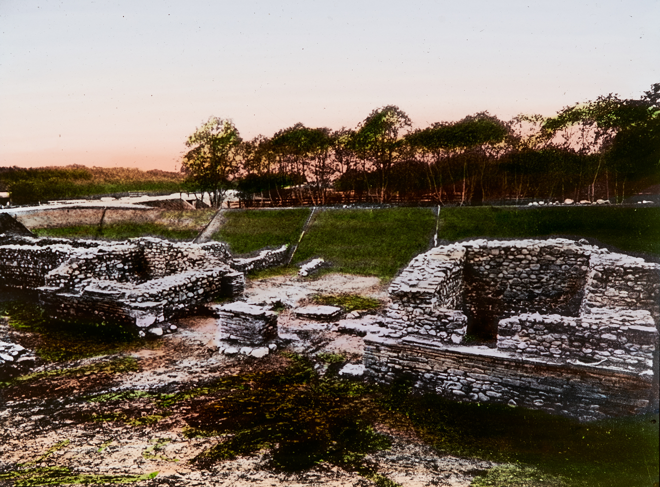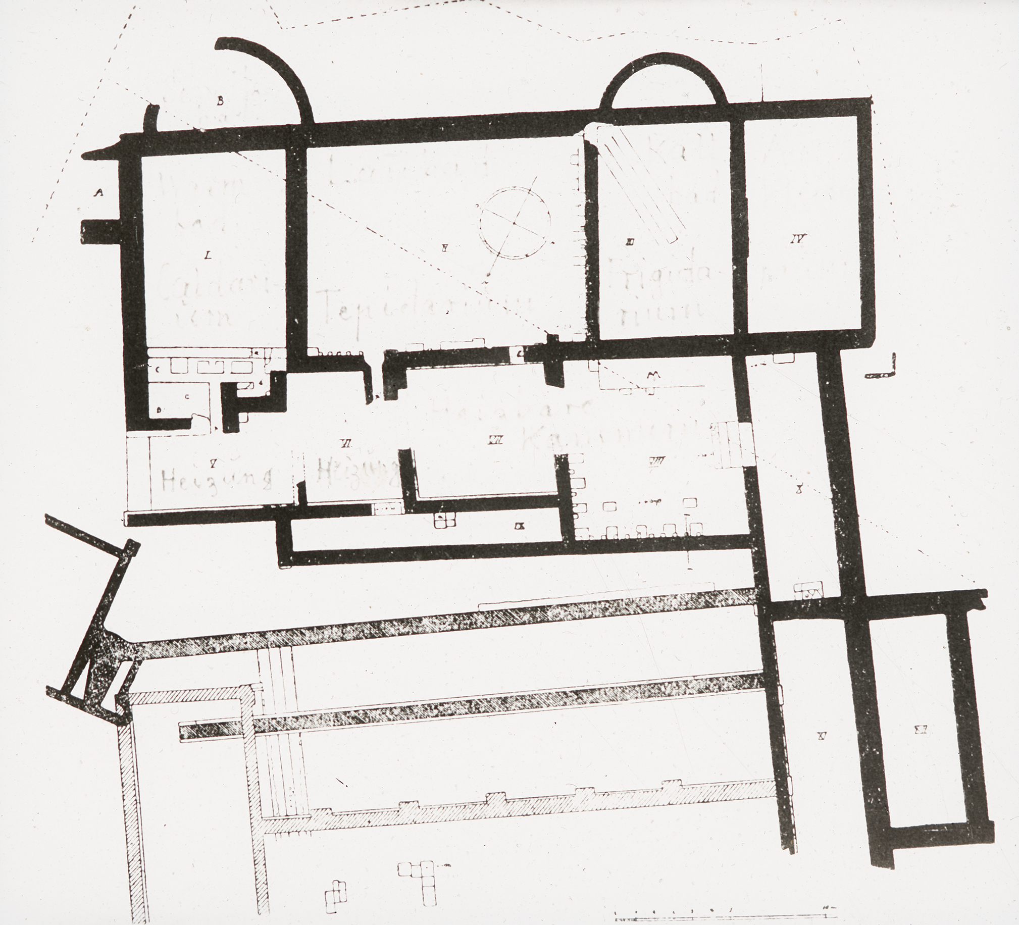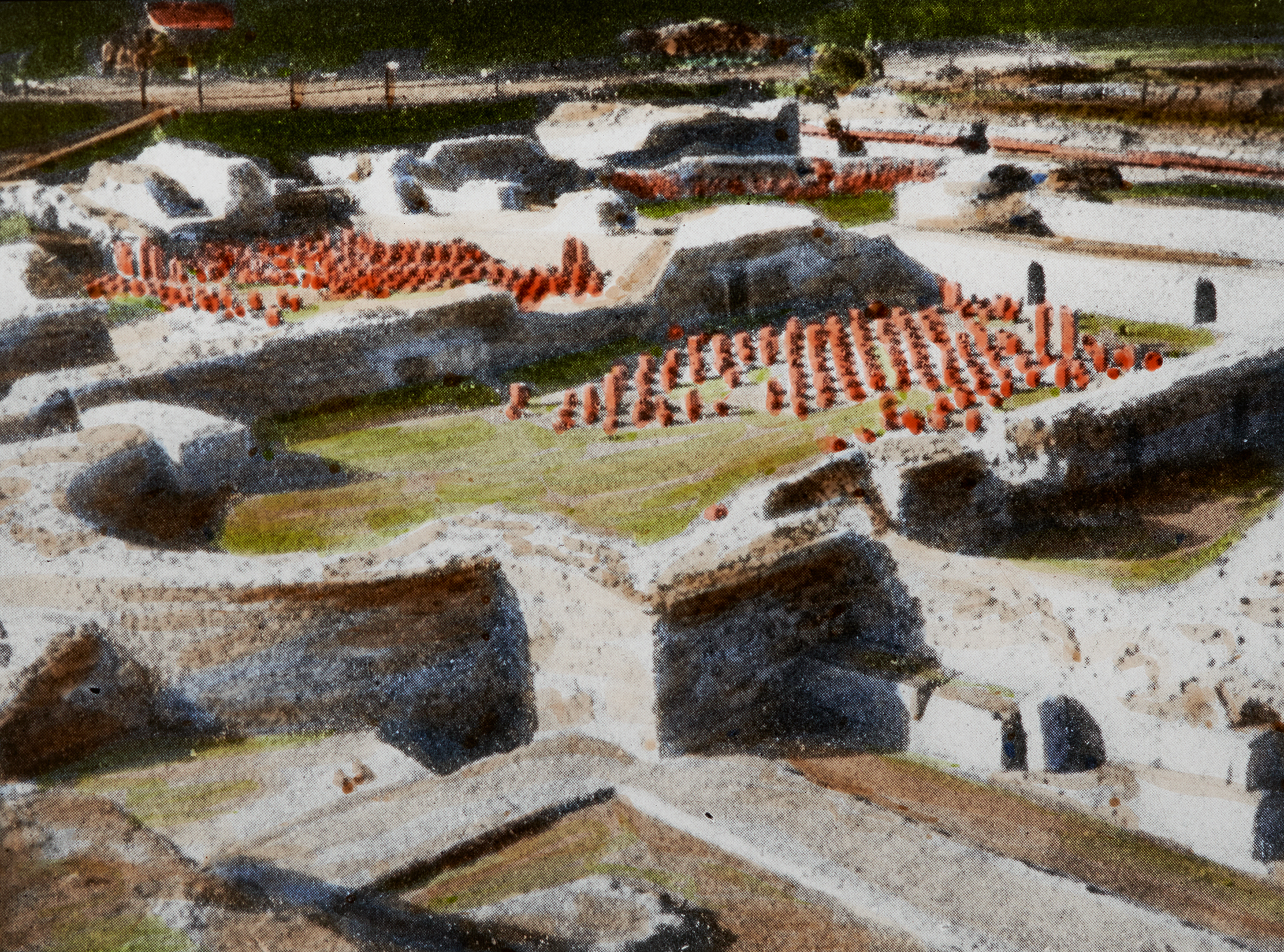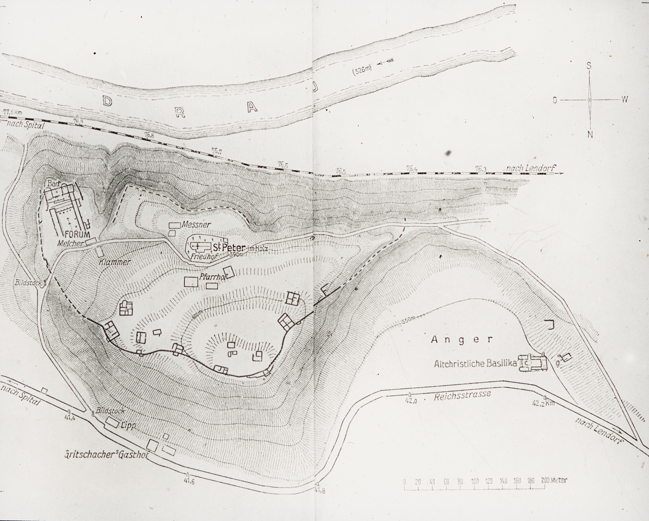 Diese Zeichnung zeigt das Legionslager Carnuntum. Sämtliche Funde von Ausgrabungen aus den Jahren 1877 bis 1911 sind eingezeichnet.