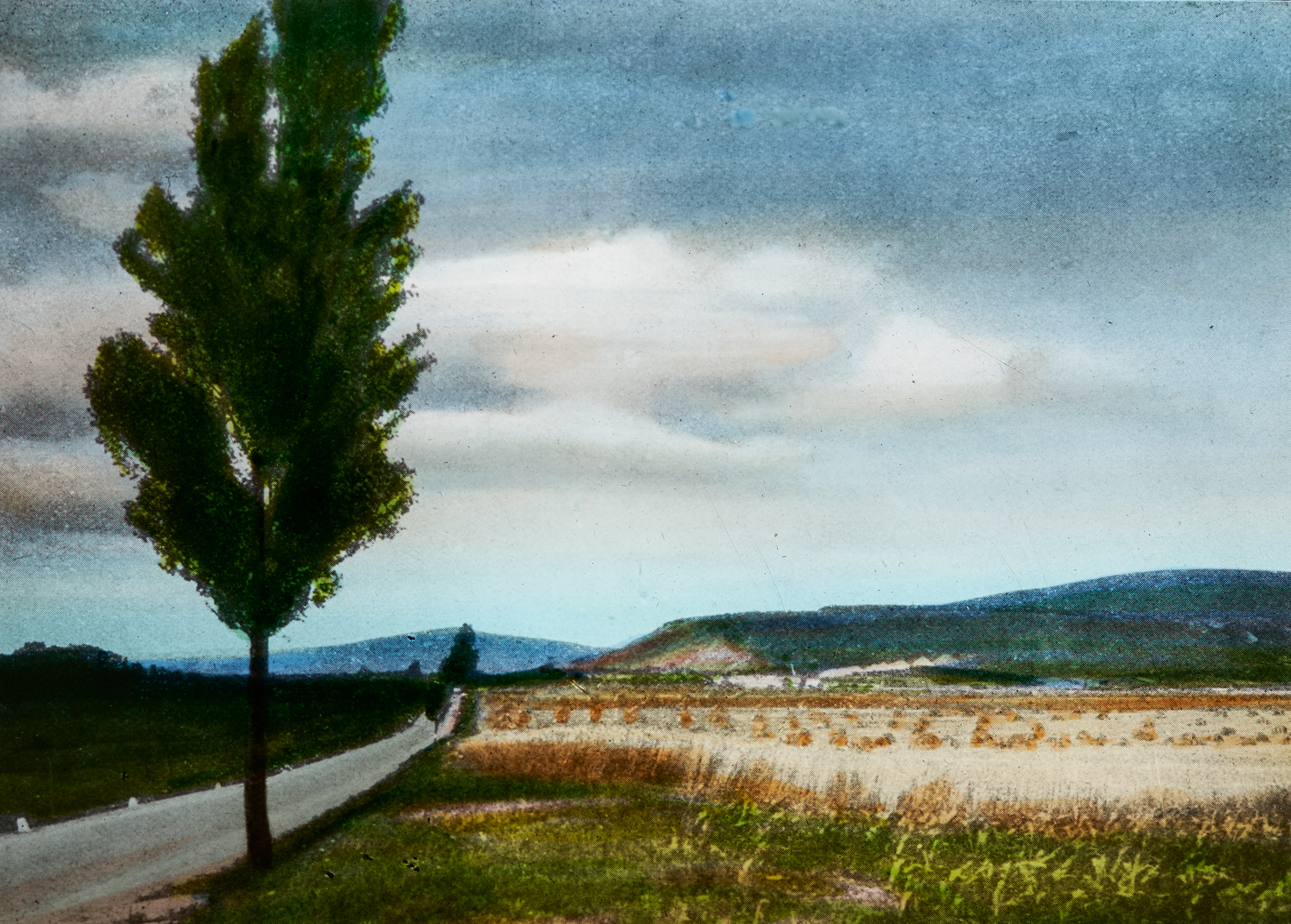 Dieses Gemälde zeigt den weiten Ausblick über eine Landschaft. Man erkennt einen befestigten Weg, links und rechts davon sind Felder.