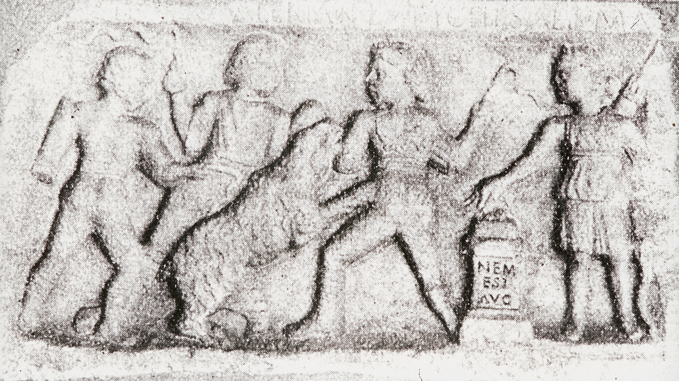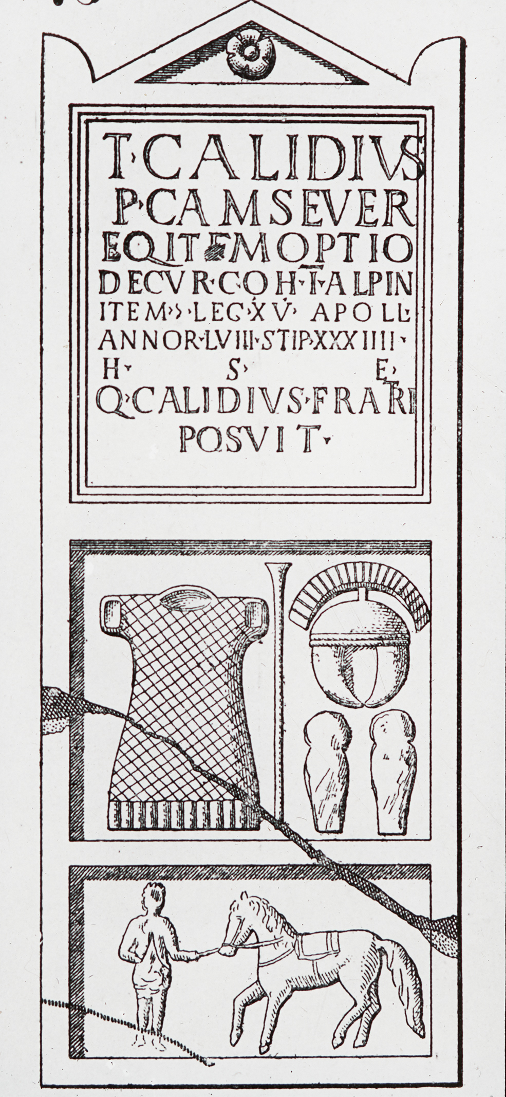 Dieser Grabstein wurde bei einer Grabung in Bad Deutsch Altenburg in Niederösterreich gefunden. Oben auf dem Grabstein ist eine Ikonographie, die einen Mann auf einem Wagen, zwei Zugtiere und einen weiteren Mann zeigt. Darunter befindet sich eine Inschrift.