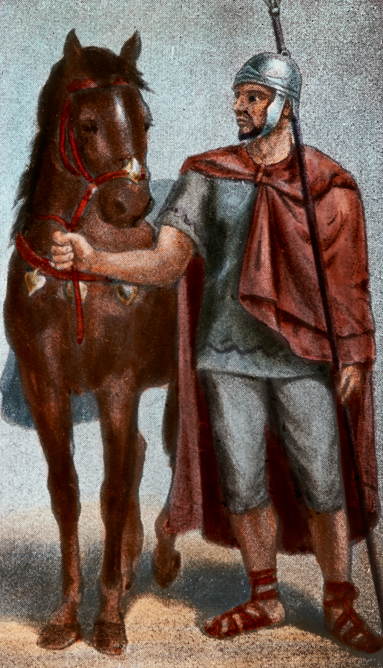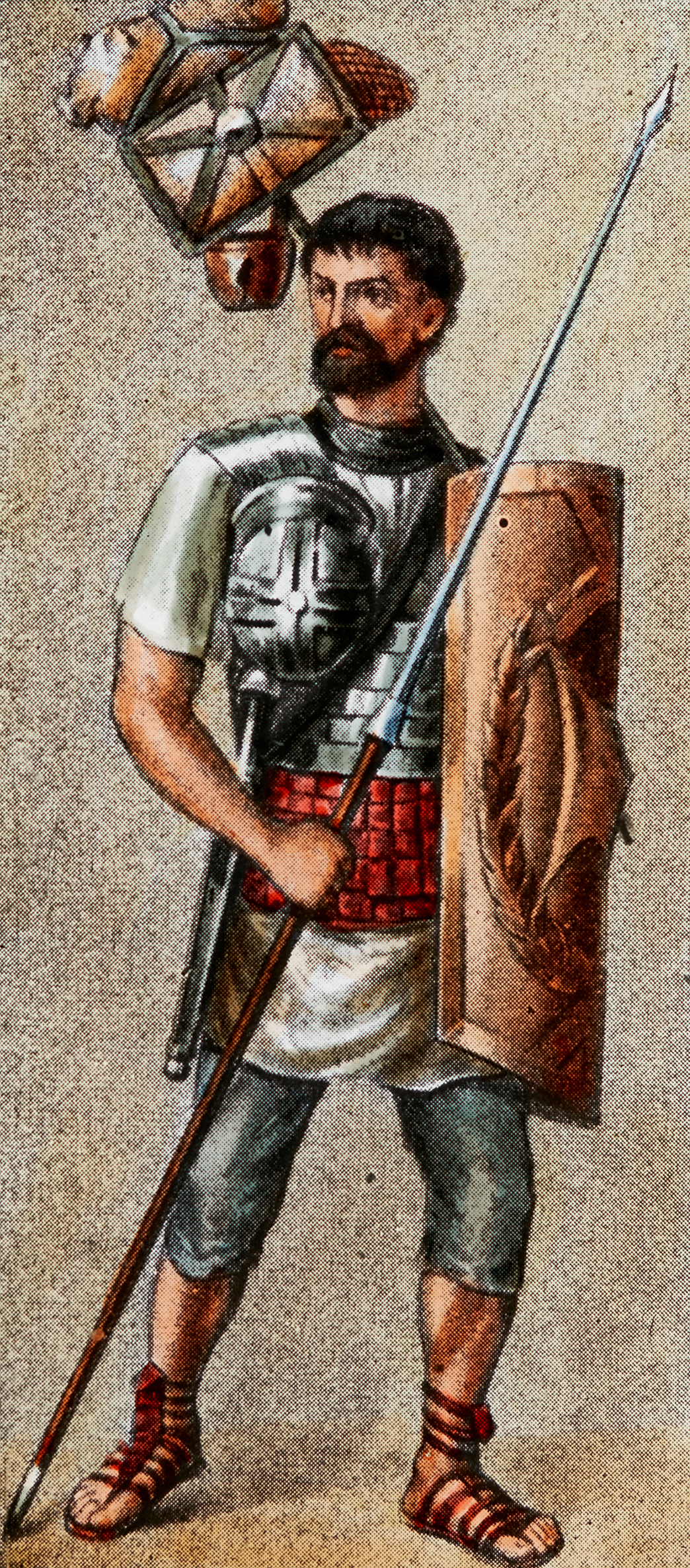 Legionäre waren Fußsoldaten der Römischen Armee. Dieser Legionär führt ein Schild, einen Speer, ein Schwert und einen Helm mit sich.