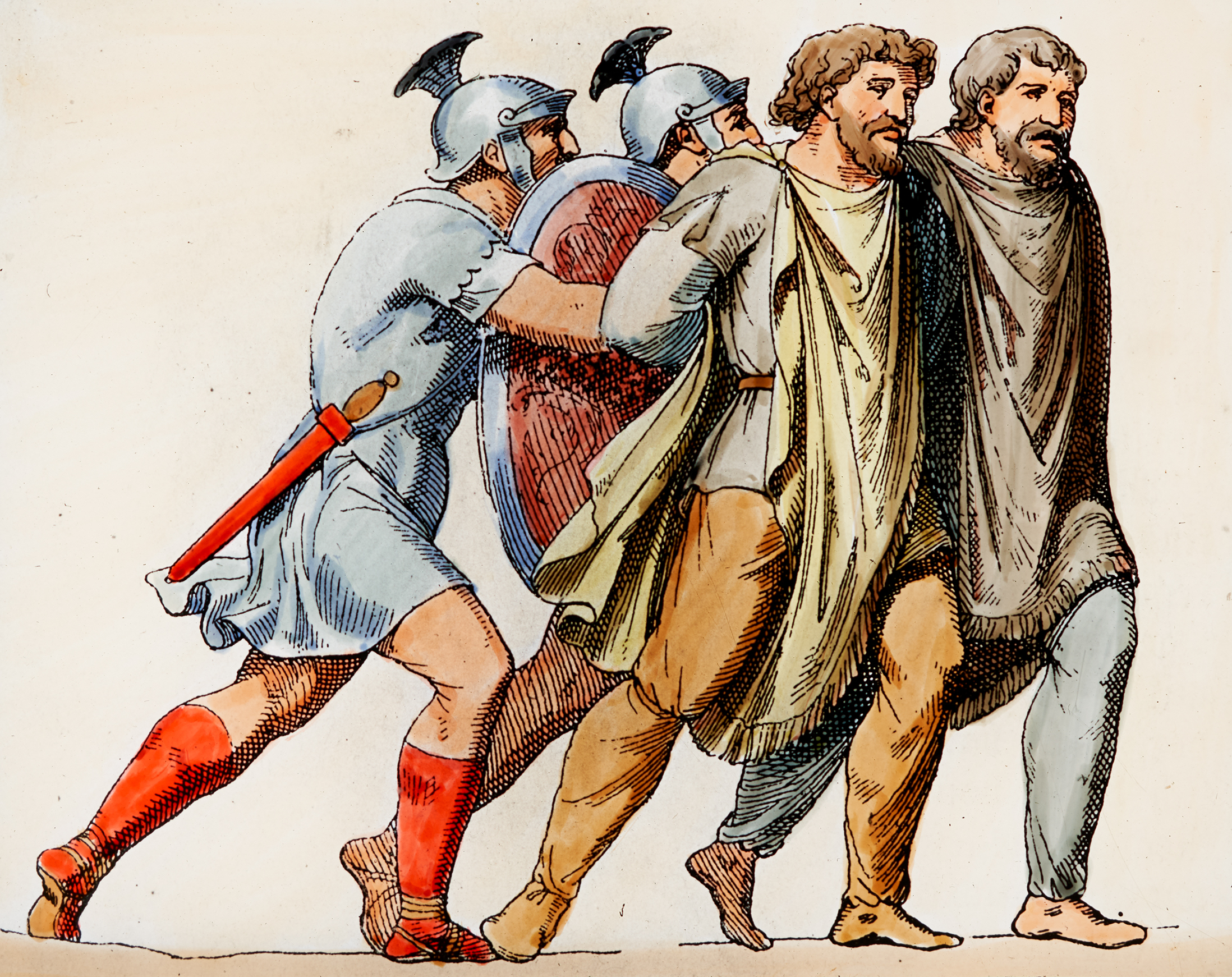 Zwei Römer nehmen zwei Ostgermanen in Gewahrsam.