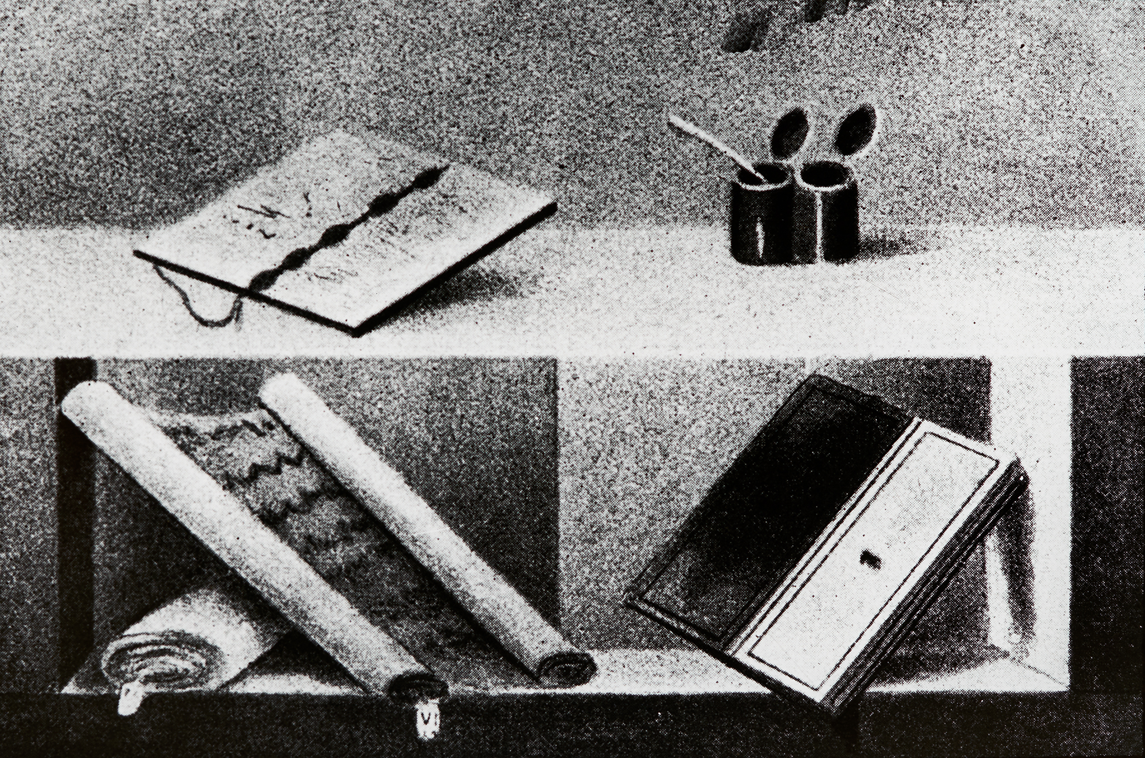 Hier sind eine Schriftrolle, eine Feder und ein Buch abgebildet.