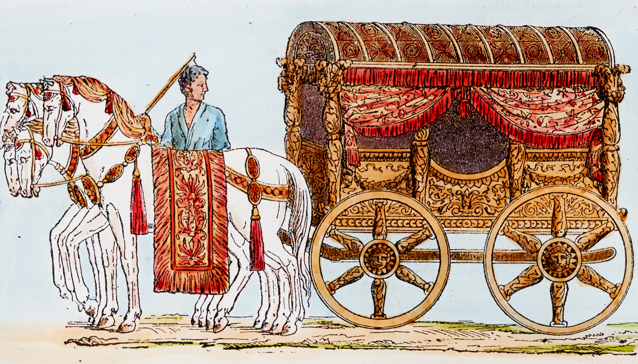 Hier zu sehen ist eine gezeichnete Reisekutsche aus dem Zeitalter der Römer. Die Kutsche wird von vier Pferden gezogen und ist prunkvoll verziert.