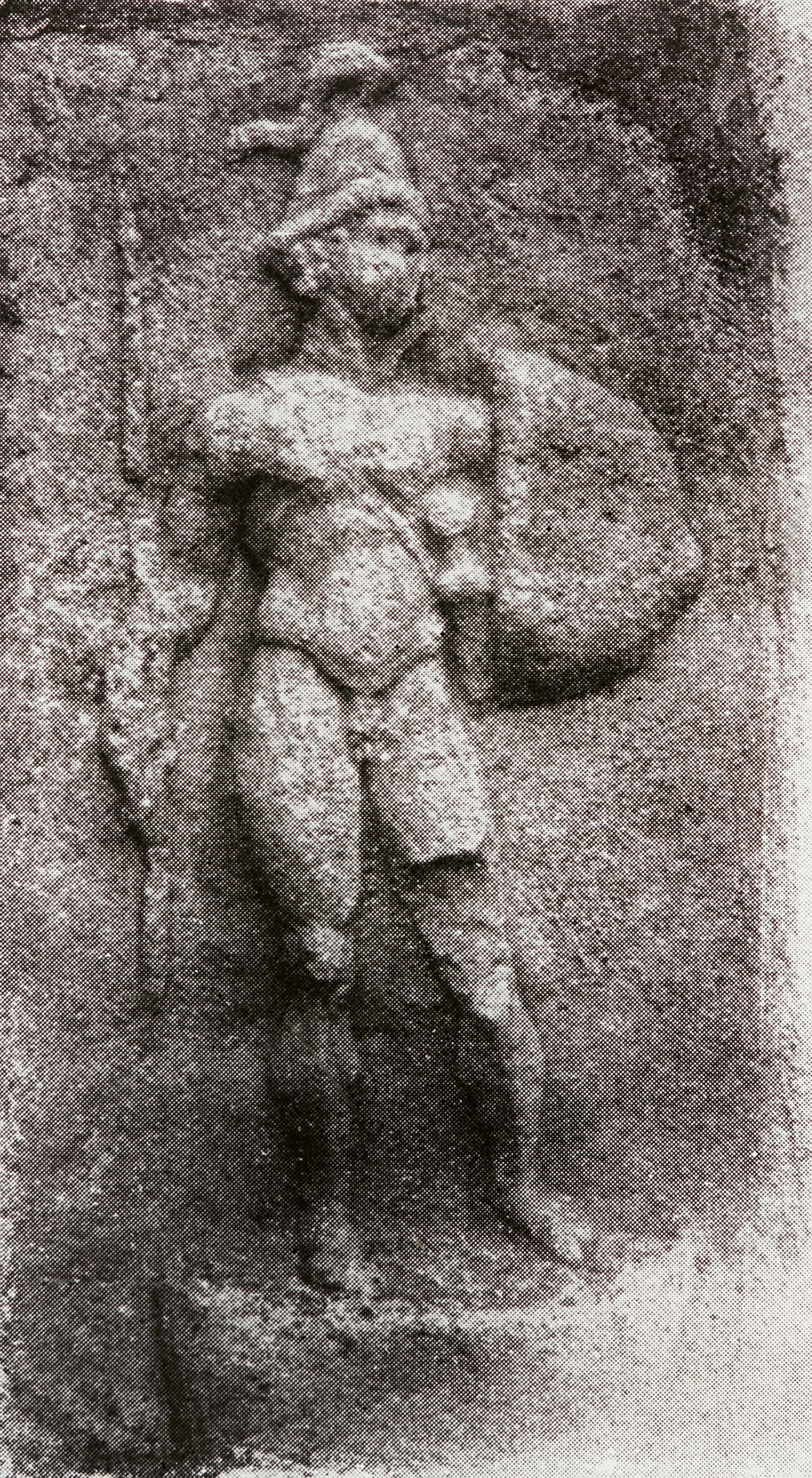 Dieser Krieger trägt ein Schild und einen Speer in den Händen. Er hat einen Helm am Kopf.