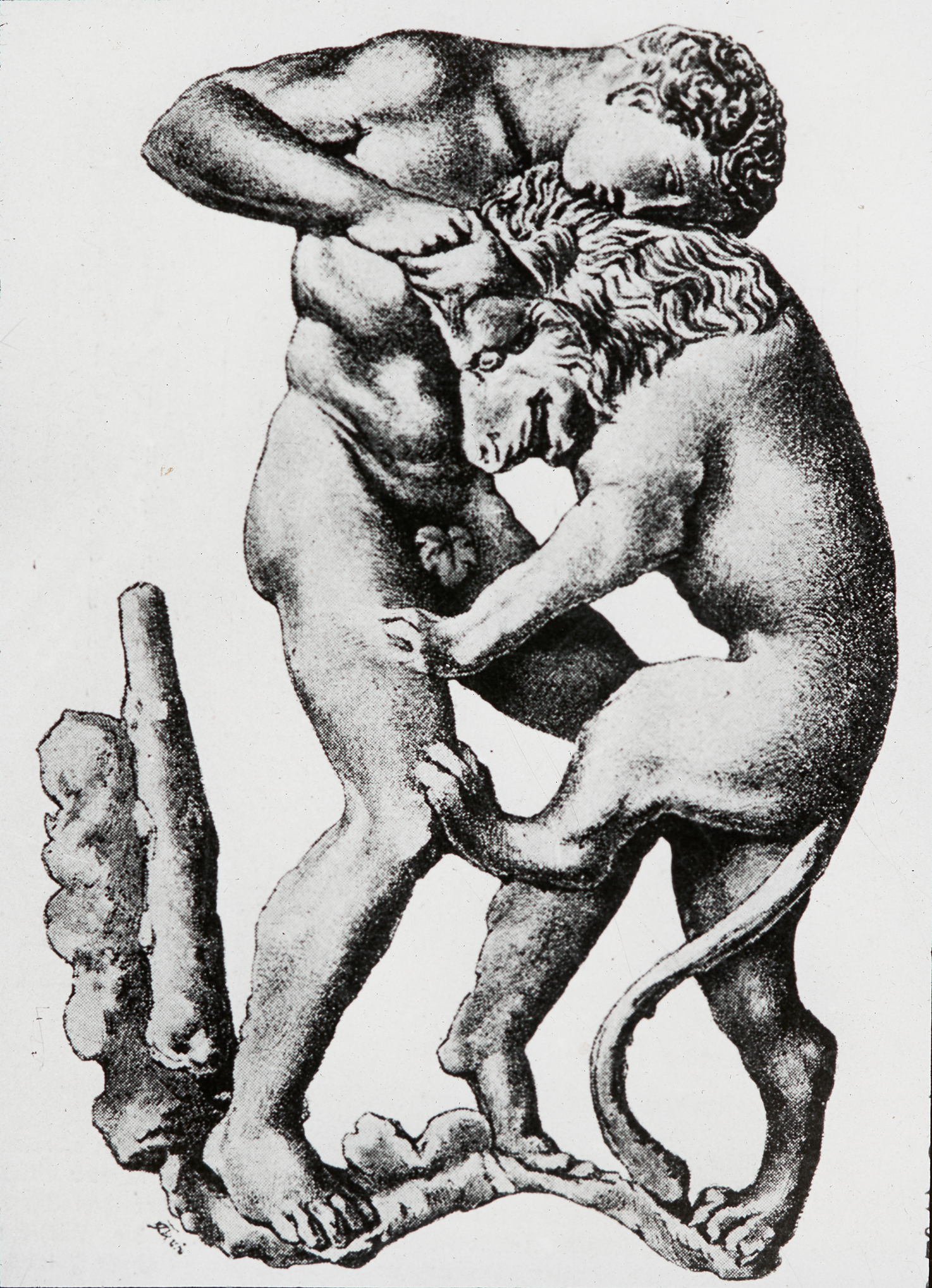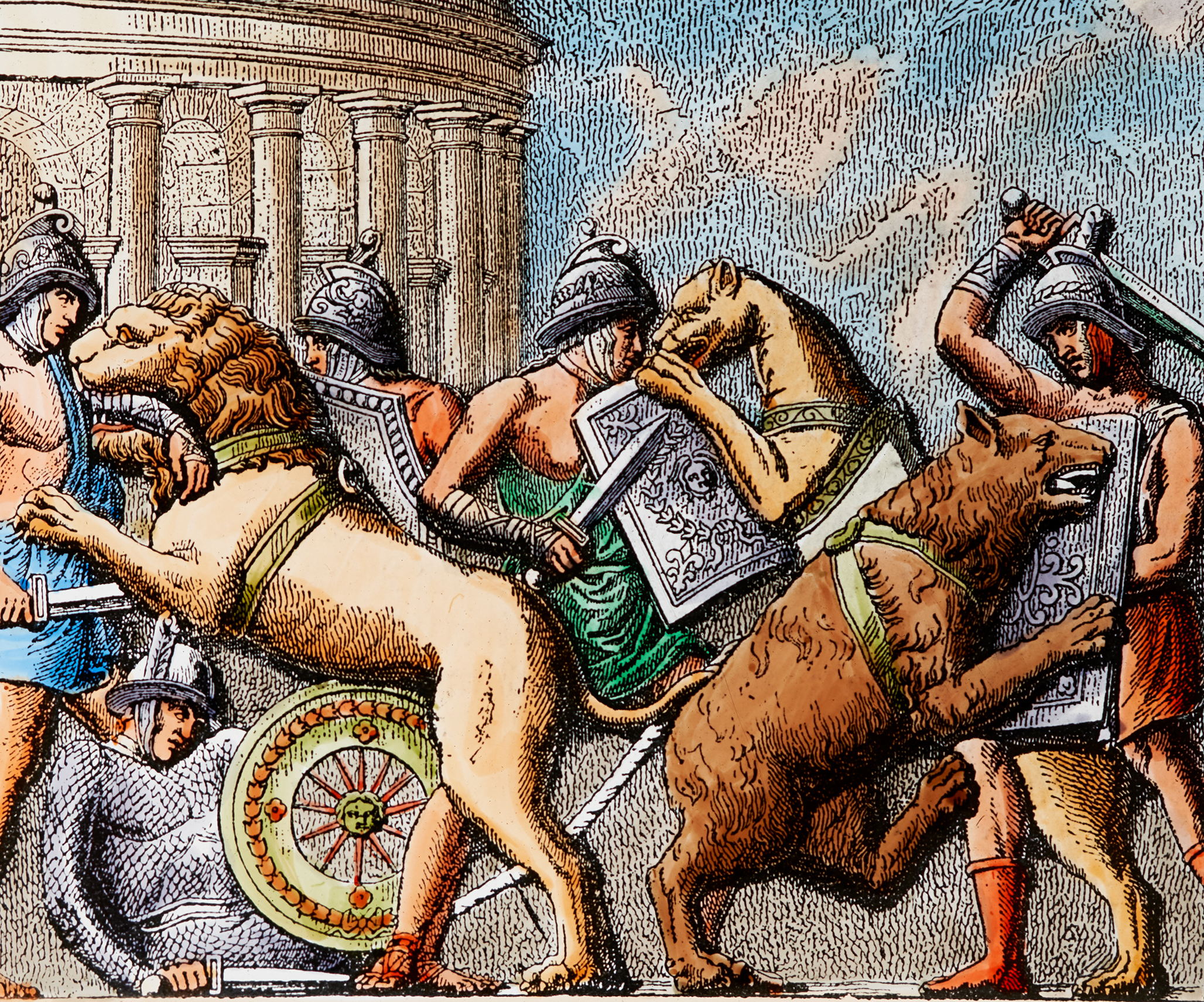 Hier abgebildet ist eine Kampfszene von Kriegern mit wilden Tieren.