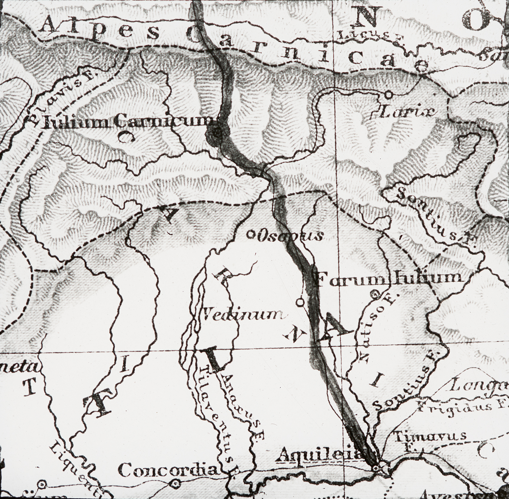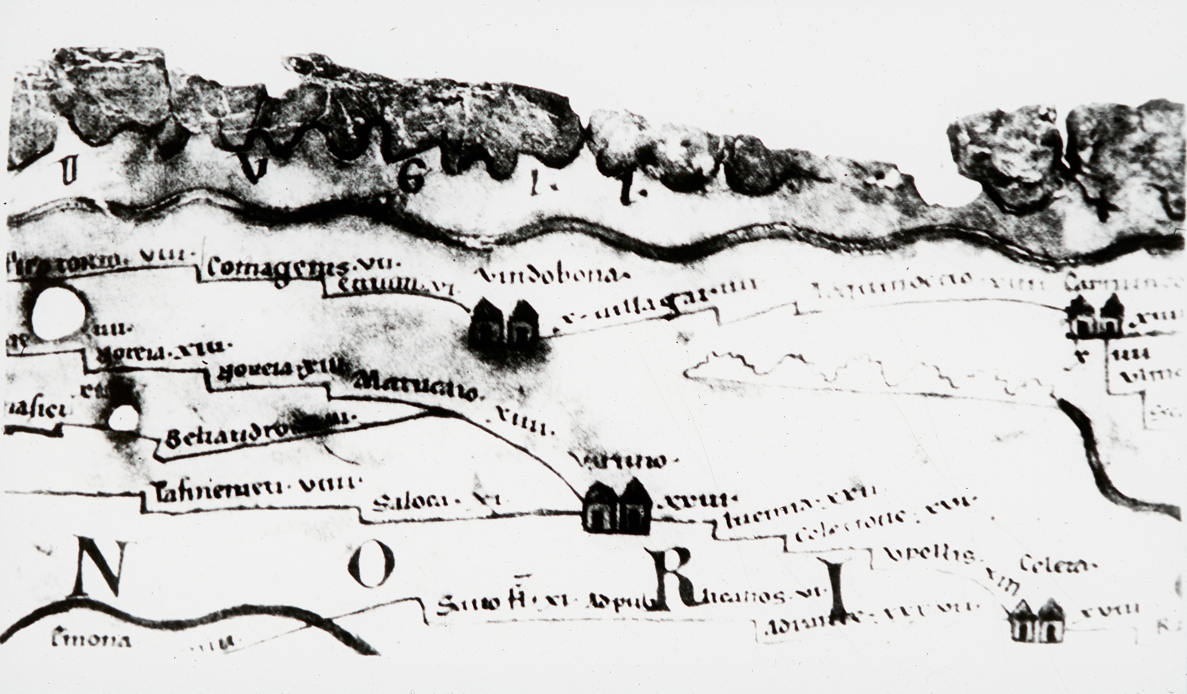 Hier sieht man einen Ausschnitt aus der Tabula Peutingeriana. Die Tabula Peutingeriana ist eine Darstellung des römischen Straßennetzes, welche von den britischen Inseln bis nach Indien reichte.