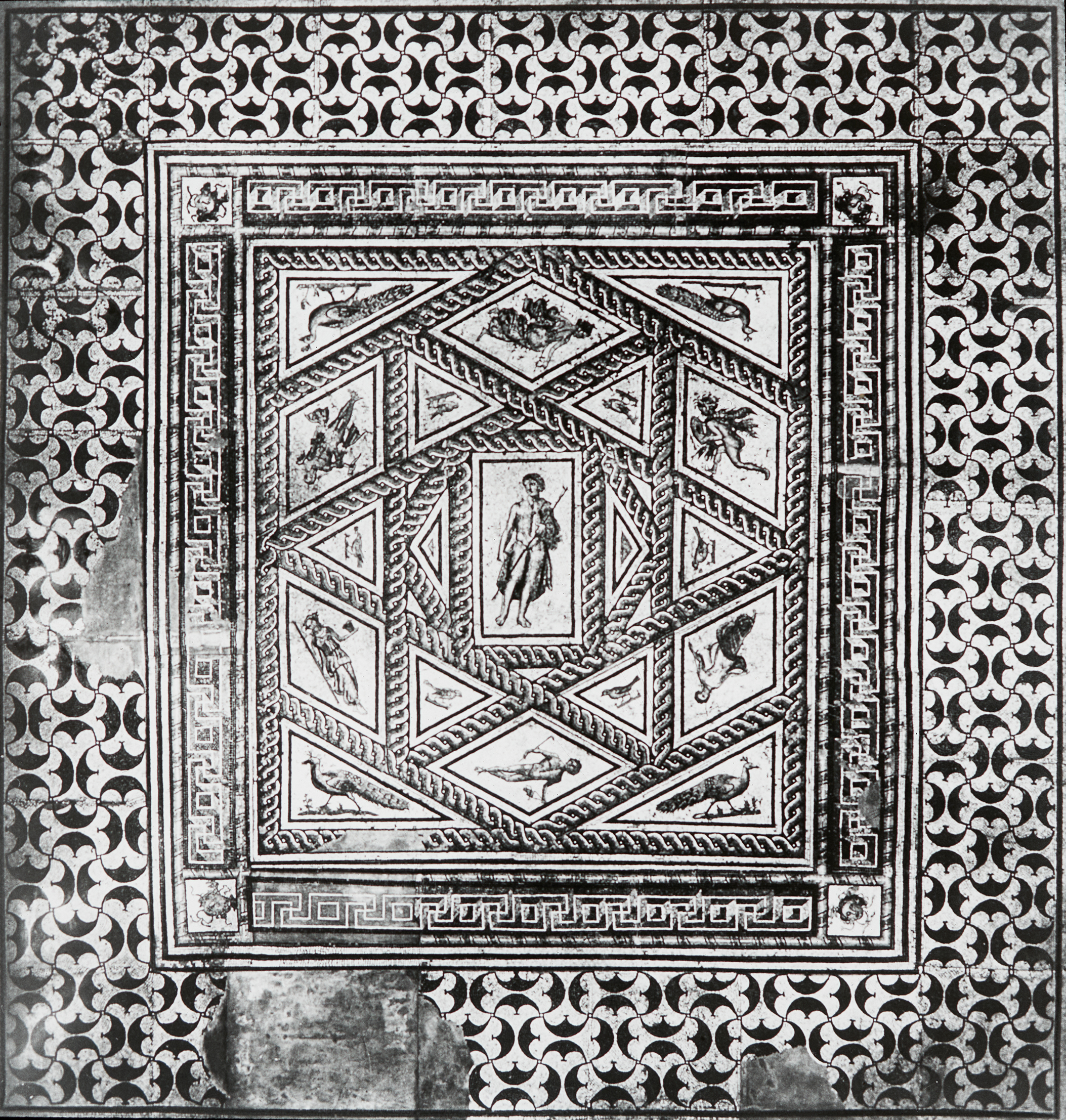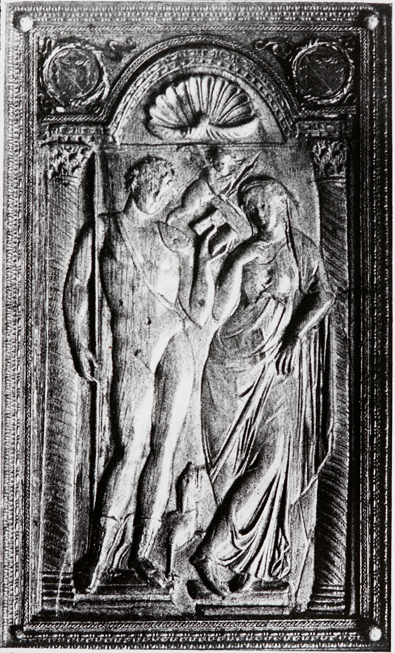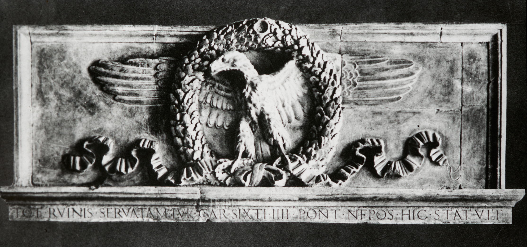 Dieses Relief befindet sich in der Basilica dei Santi Apostoli in Rom. Es zeigt einen Adler, der von einem Kranz umrandet ist. Darunter erkennt man eine Inschrift auf Latein.
