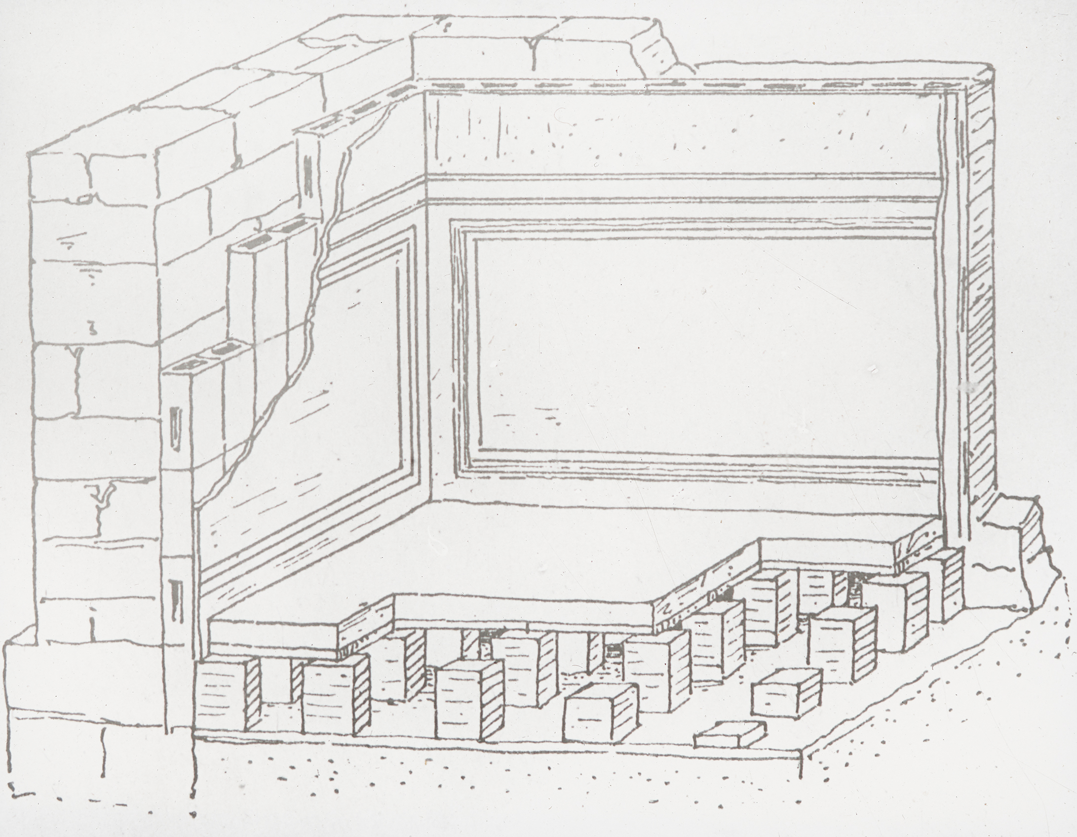 In diese Steinmauer sind Löcher eingelassen. Es handelt sich hier vermutlich um eine Grabungsstätte.