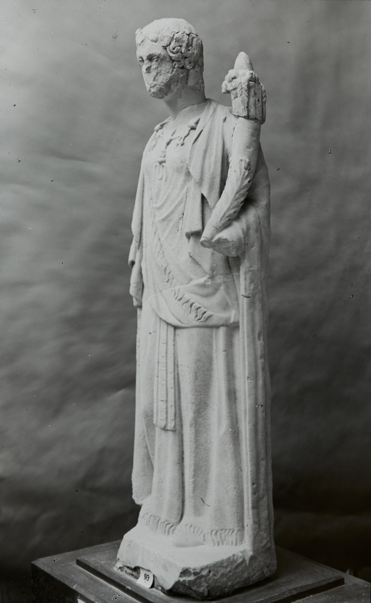 Diese Statue zeigt einen Mann in Toga. Er hebt seinen rechten Arm.
