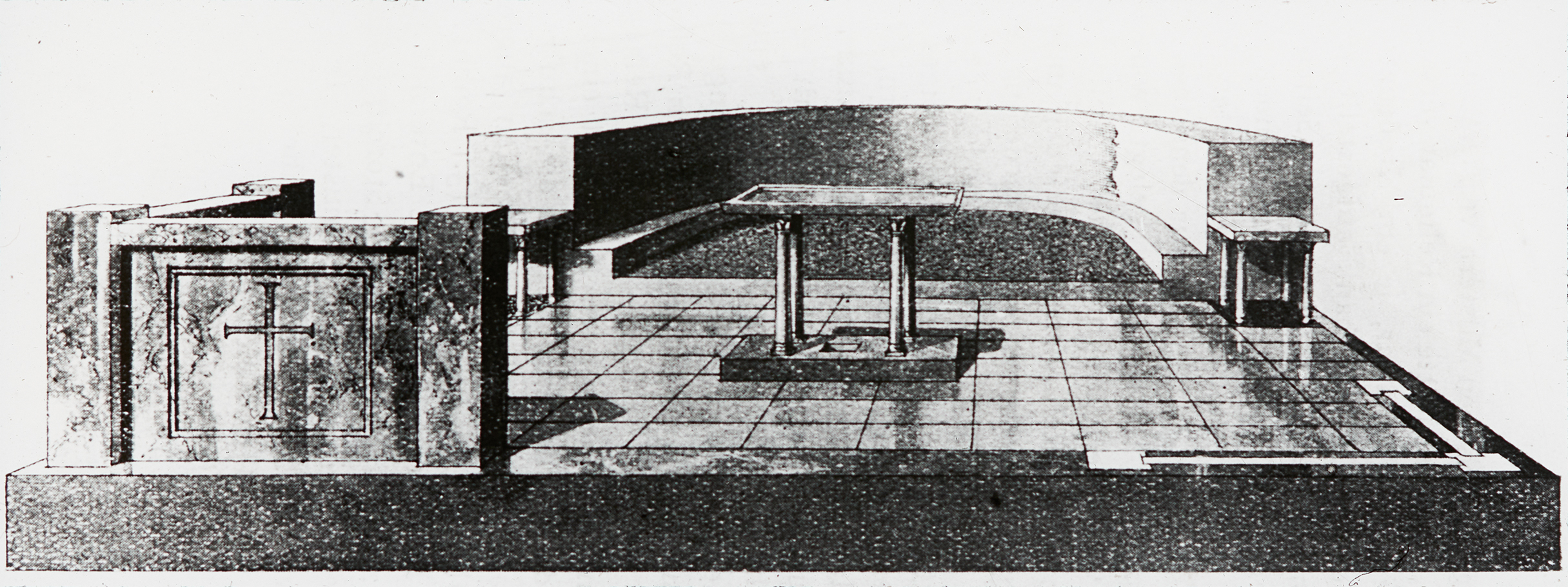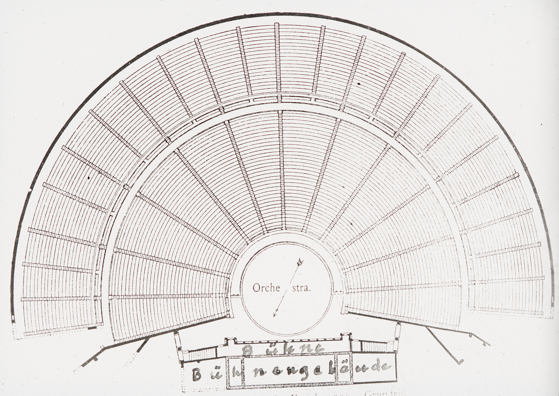 Hier erkennt man den Aufbau einer Bühne. Hinter der Bühne ist das Bühnengebäude eingezeichnet, davor erkennt man den Platz für das Orchester. In Halbkreisen um das Orchester sind die Zuschauerränge angeordnet.
