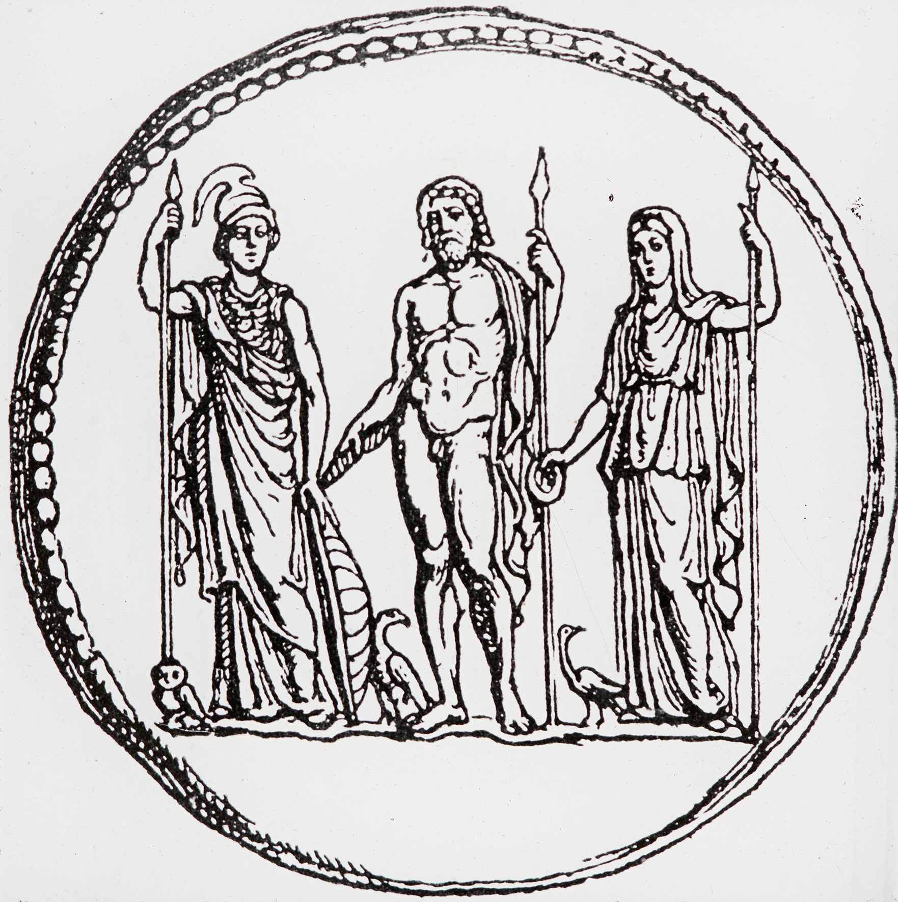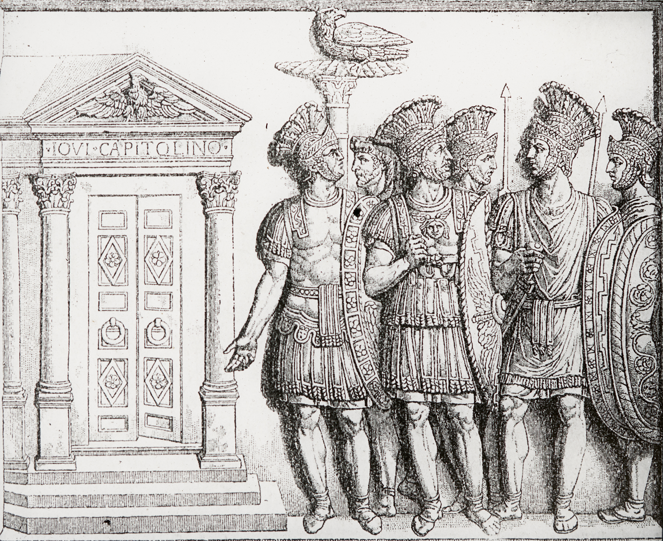 Dies ist eine Zeichnung des Grabsteins eines Centurios. Centurios waren Offiziere im römischen Reich, die Befehlshaber über eine Gefolgschaft von 80 - 100 Soldaten waren. Unter der Inschrift ist die Ausrüstung des Centurios abgebildet.