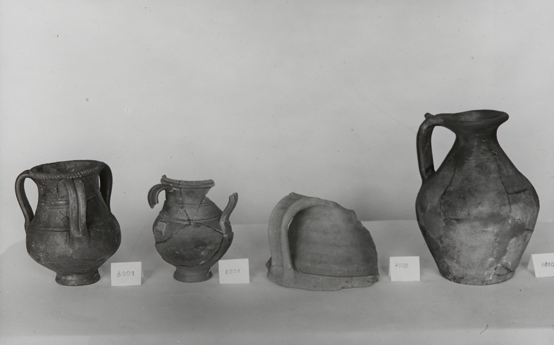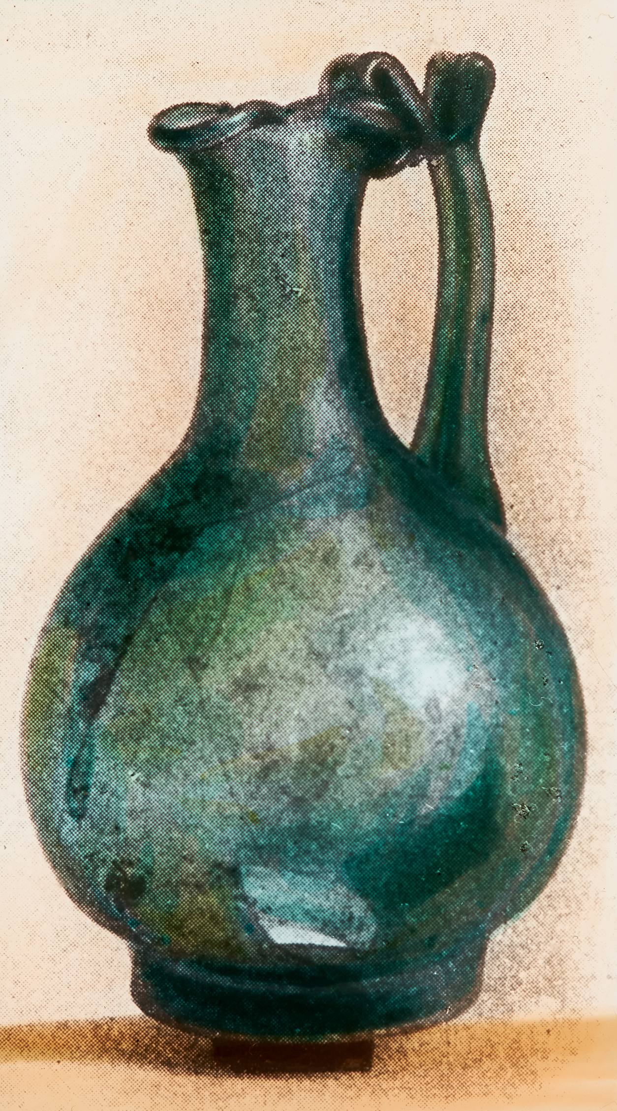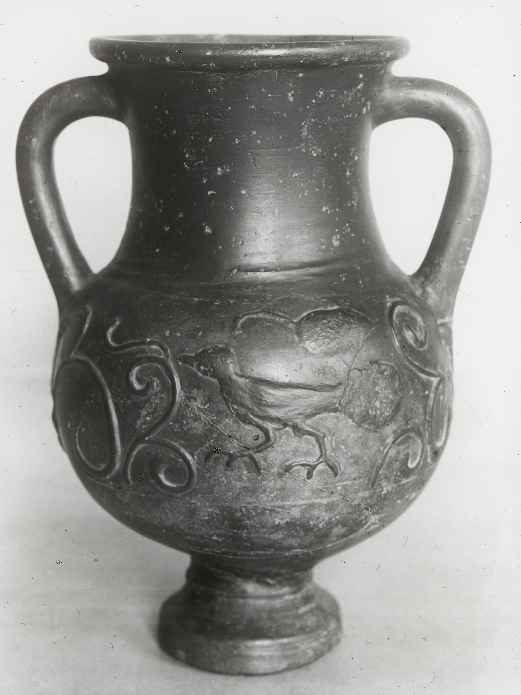 Ein Krug mit zwei Henkeln. Der Krug ist verziert, man erkennt mittig einen Vogel.