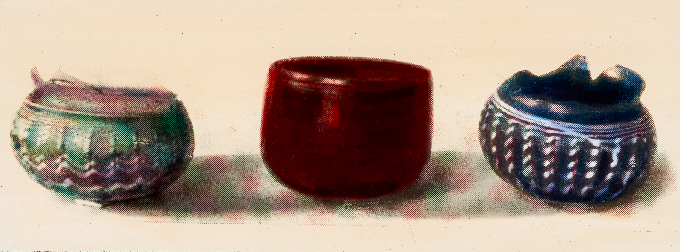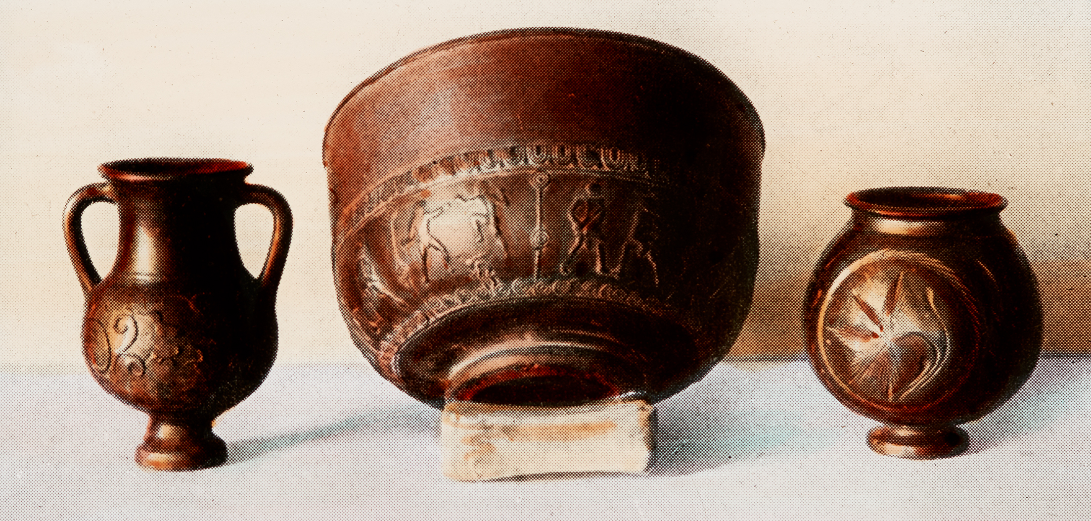 3 Gefäße in unterschiedlichen Farben, die beiden Gefäße außen sind verziert.
