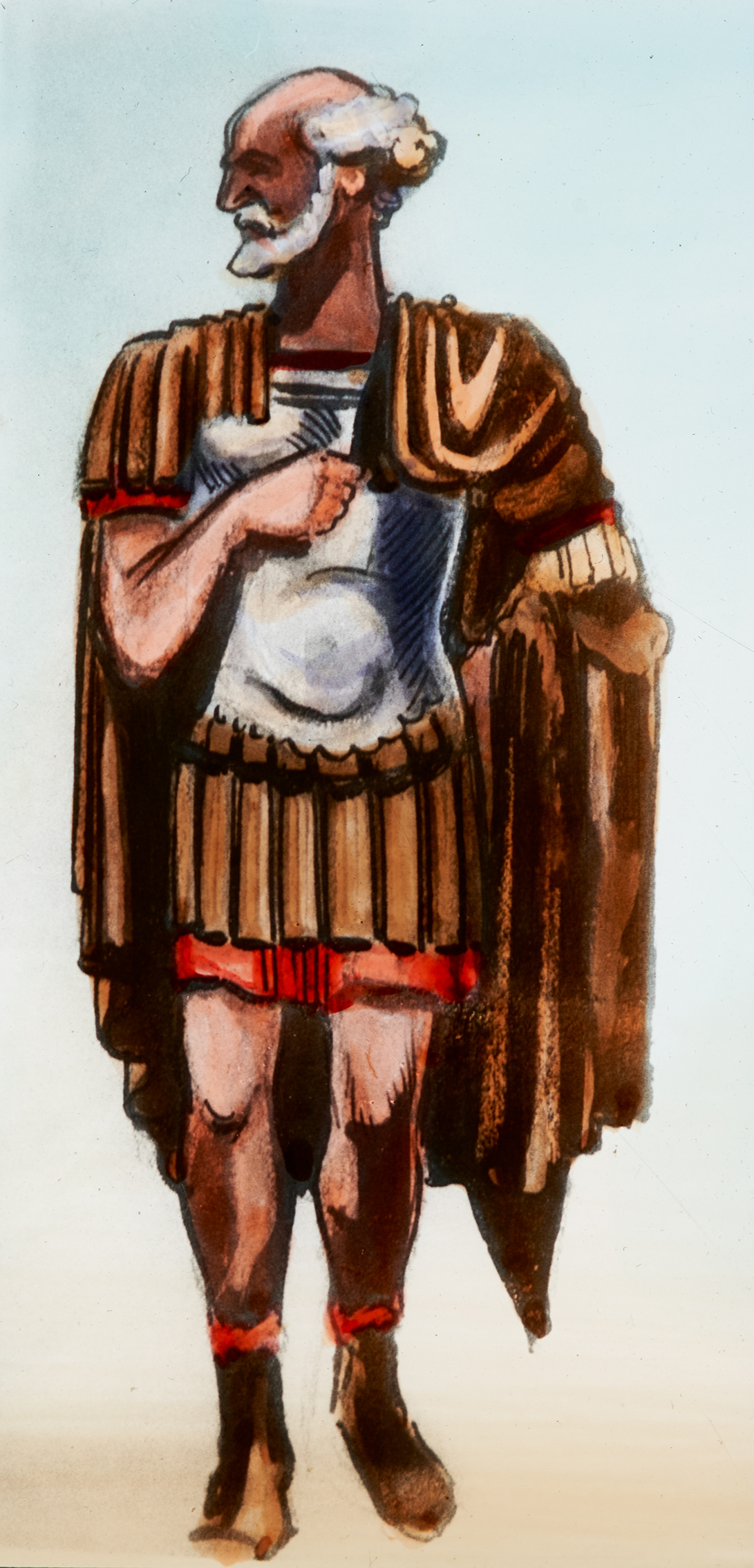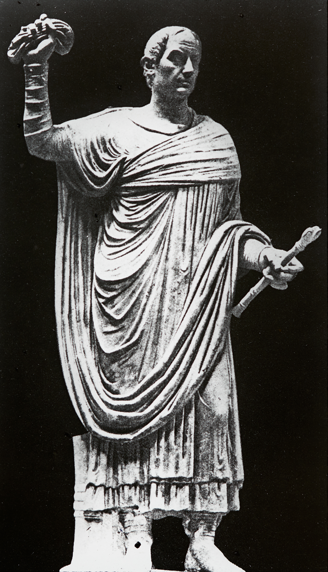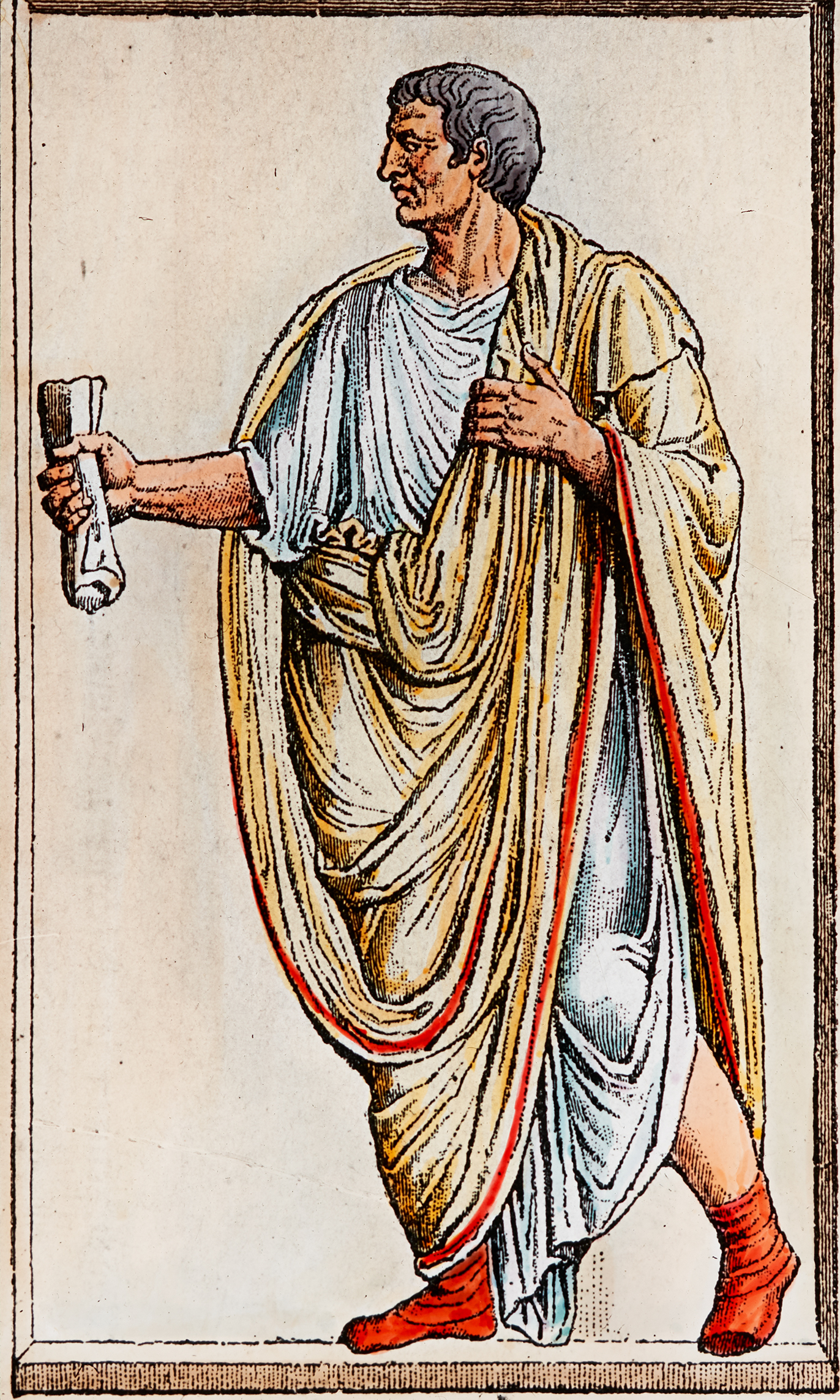 Ein römischer Bürger, gekleidet in eine Tunika. Er hält eine Schriftrolle in der rechten Hand.