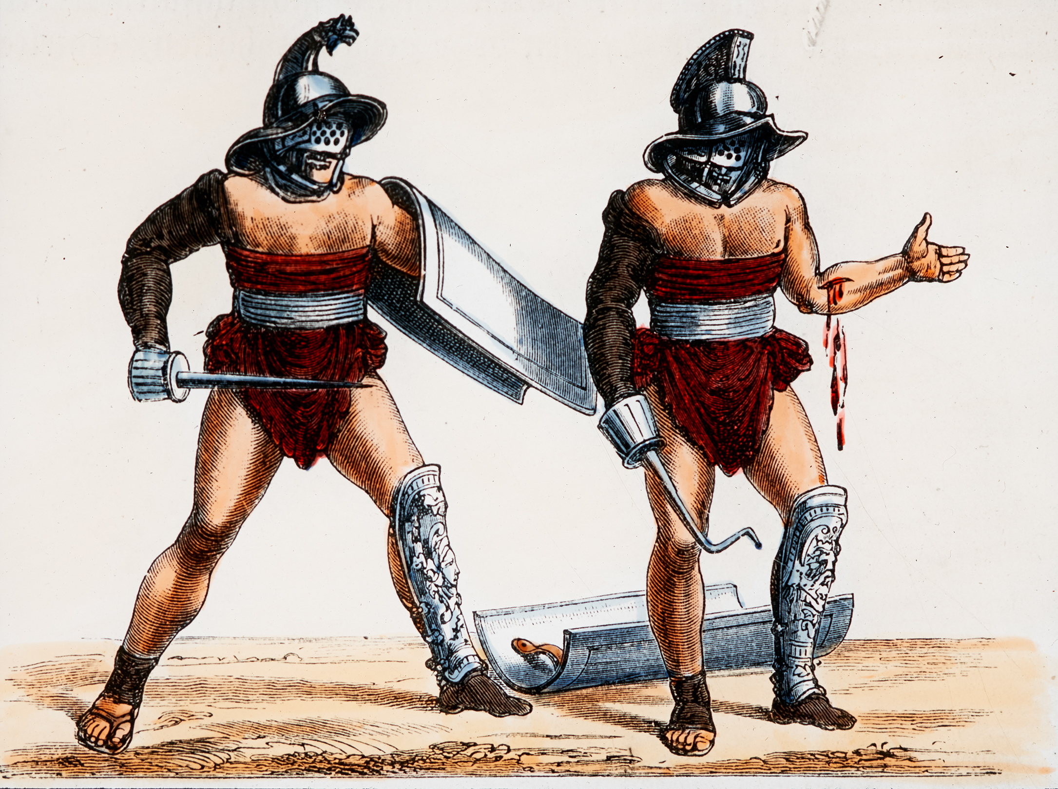 Diese beiden römischen Gladiatoren kämpfen gegeneinander. Der Gladiator auf der rechten Seite wurde am linken Arm verwundet. Sein Schild liegt am Boden.
