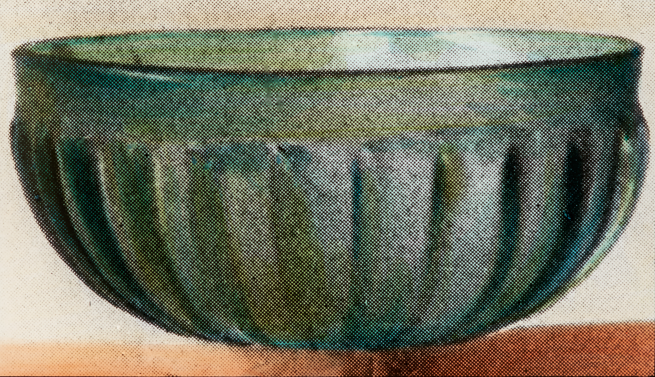 Eine grünliche Schale mit Einkerbungen auf der Außenseite.