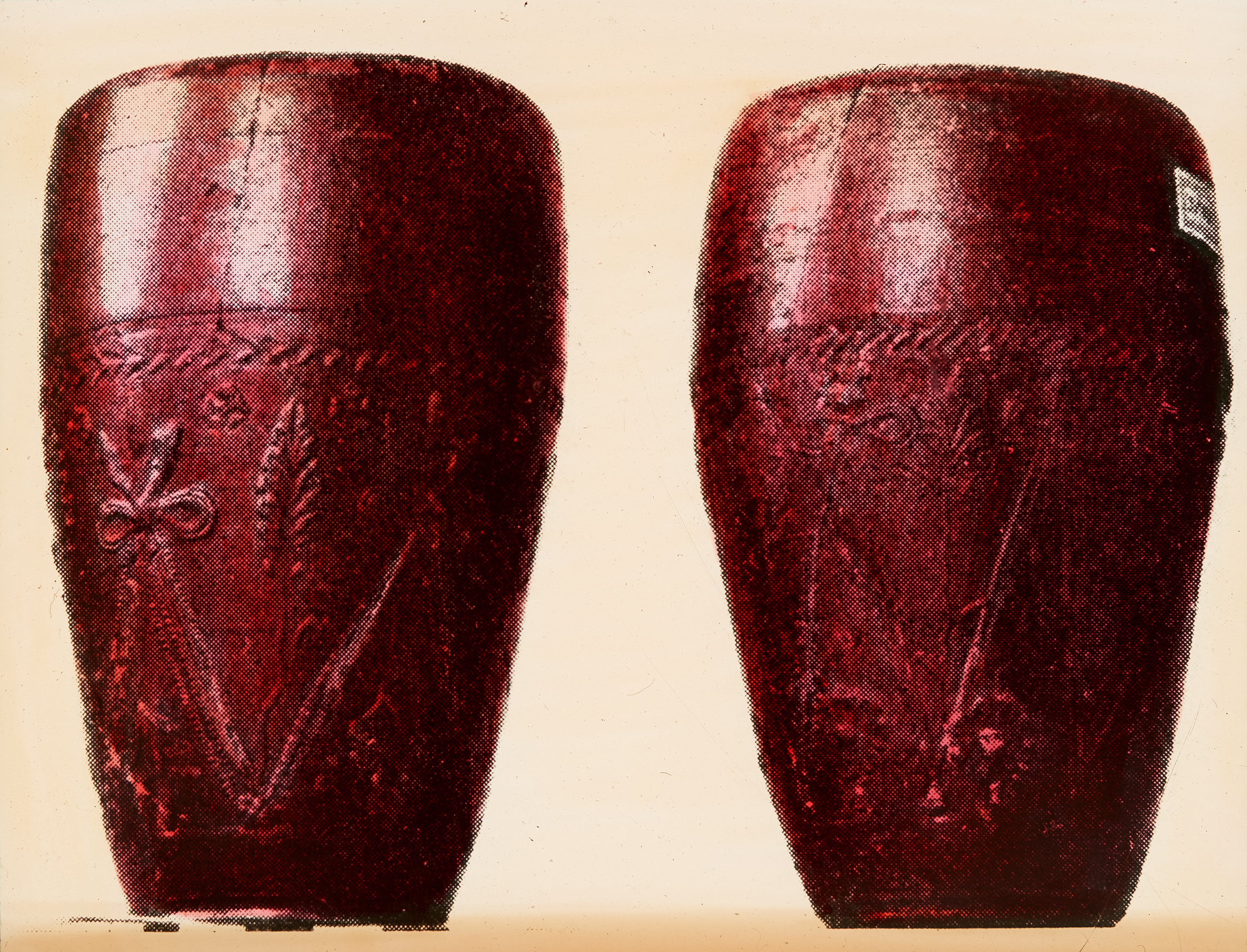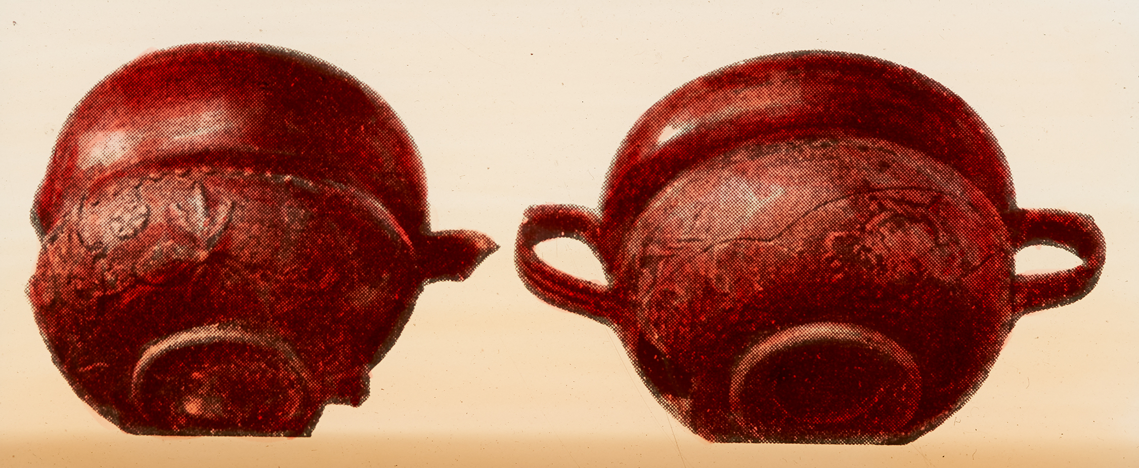 2 Gefäße in roter Farbe mit Verzierungen. Das rechte Gefäß hat rechts oben eine weiße Markierung.