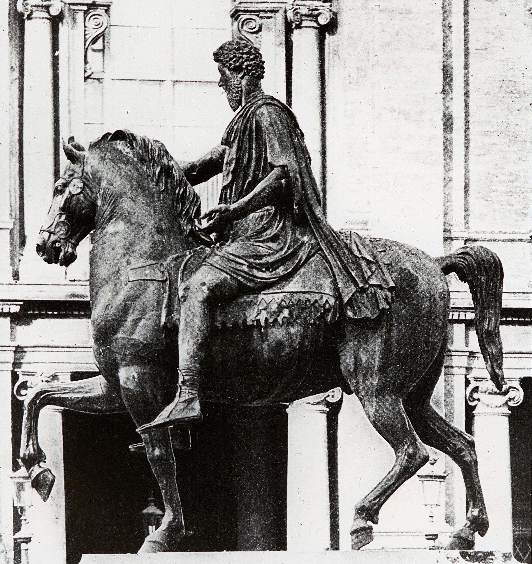 Eine Statue von Mark Aurel beim Reiten. Die Statue wurde von 161 bis 180 nach Christus angefertigt und befindet sich am Piazza del Campidoglio in Rom. Mark Aurel lebte von 121 bis 180 nach Christus und war Kaiser des Römischen Reichs.