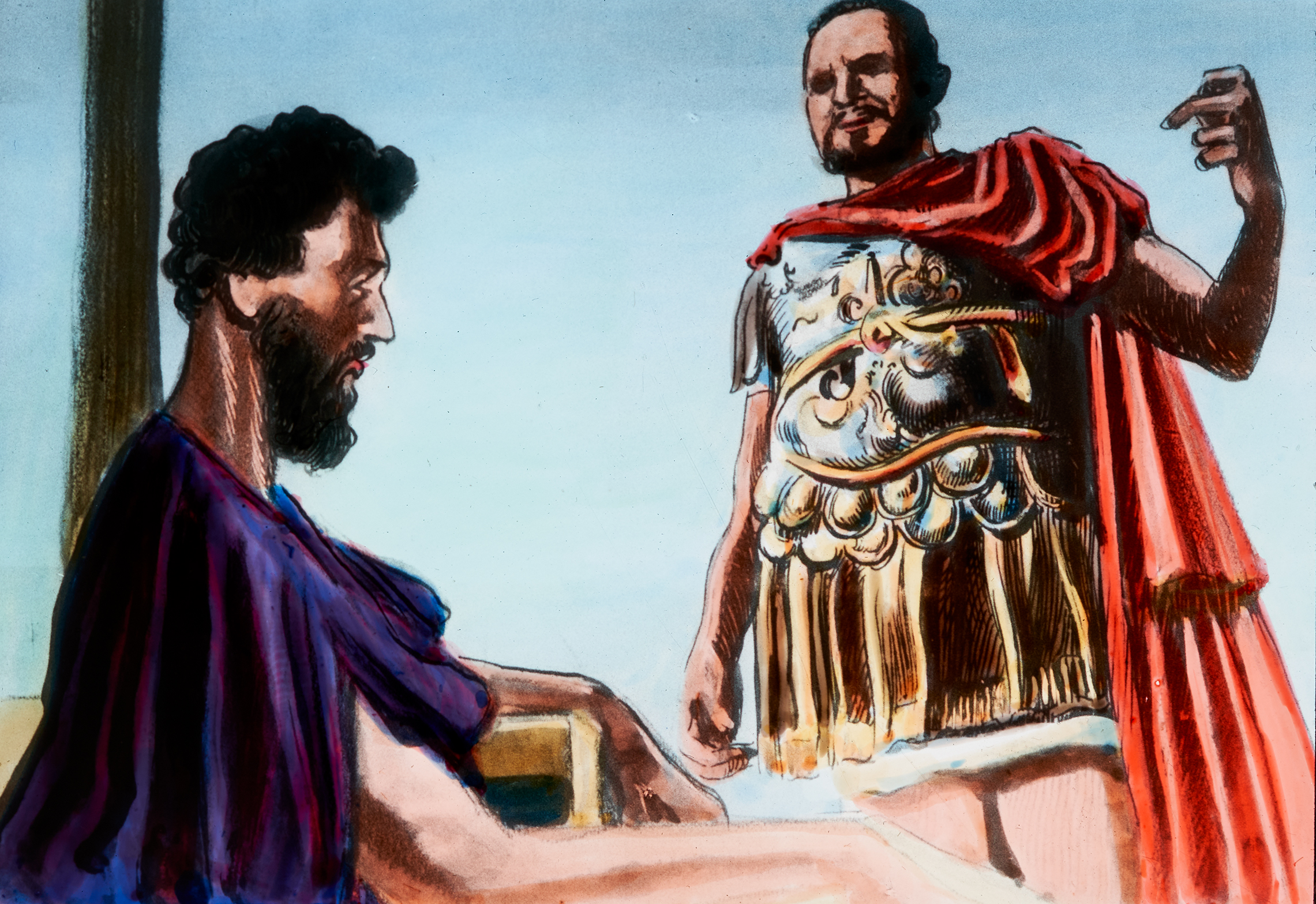 Zwei Römer unterhalten sich. Der Mann links trägt eine Toga und sitzt, während der Mann rechts eine Rüstung trägt und steht. Dieser hebt seinen linken Arm.