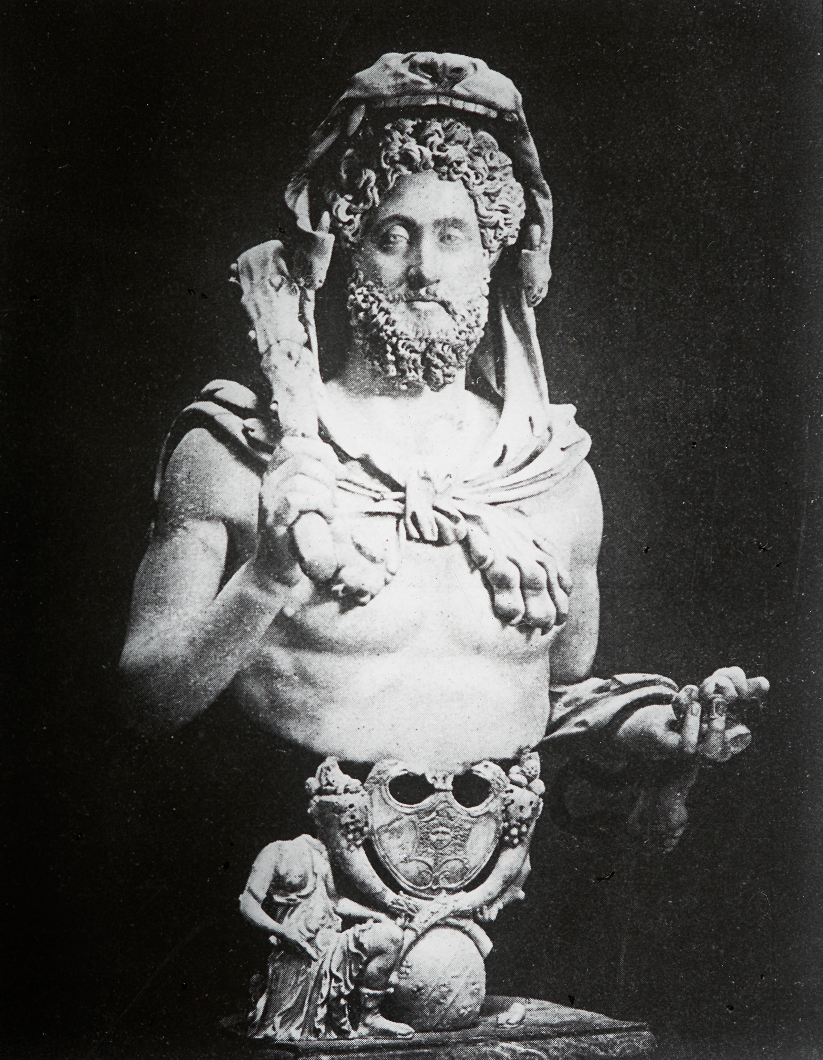 Diese Statue zeigt den römischen Kaiser Commodus, verkleidet als Herkules. Er trägt ein Löwenfell um den Kopf und hält eine Keule und goldene Äpfel der Hesperiden in den Händen. Commodus war Kaiser des Römischen Reichs und lebte von 161 bis 192 nach Christus.