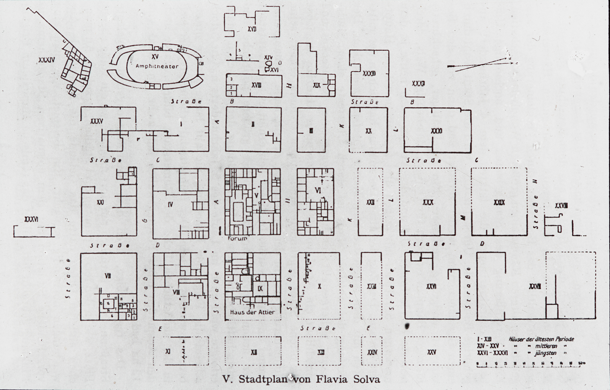 Flavia Solva war eine römische Stadt in der heutigen Steiermark. Hier ist ein Stadtplan der Stadt zu sehen, heute befindet sich dort die Ortschaft Wagna. Die Stadt verfügte auch über ein Amphitheater, das in der Zeichnung links oben verzeichnet ist.