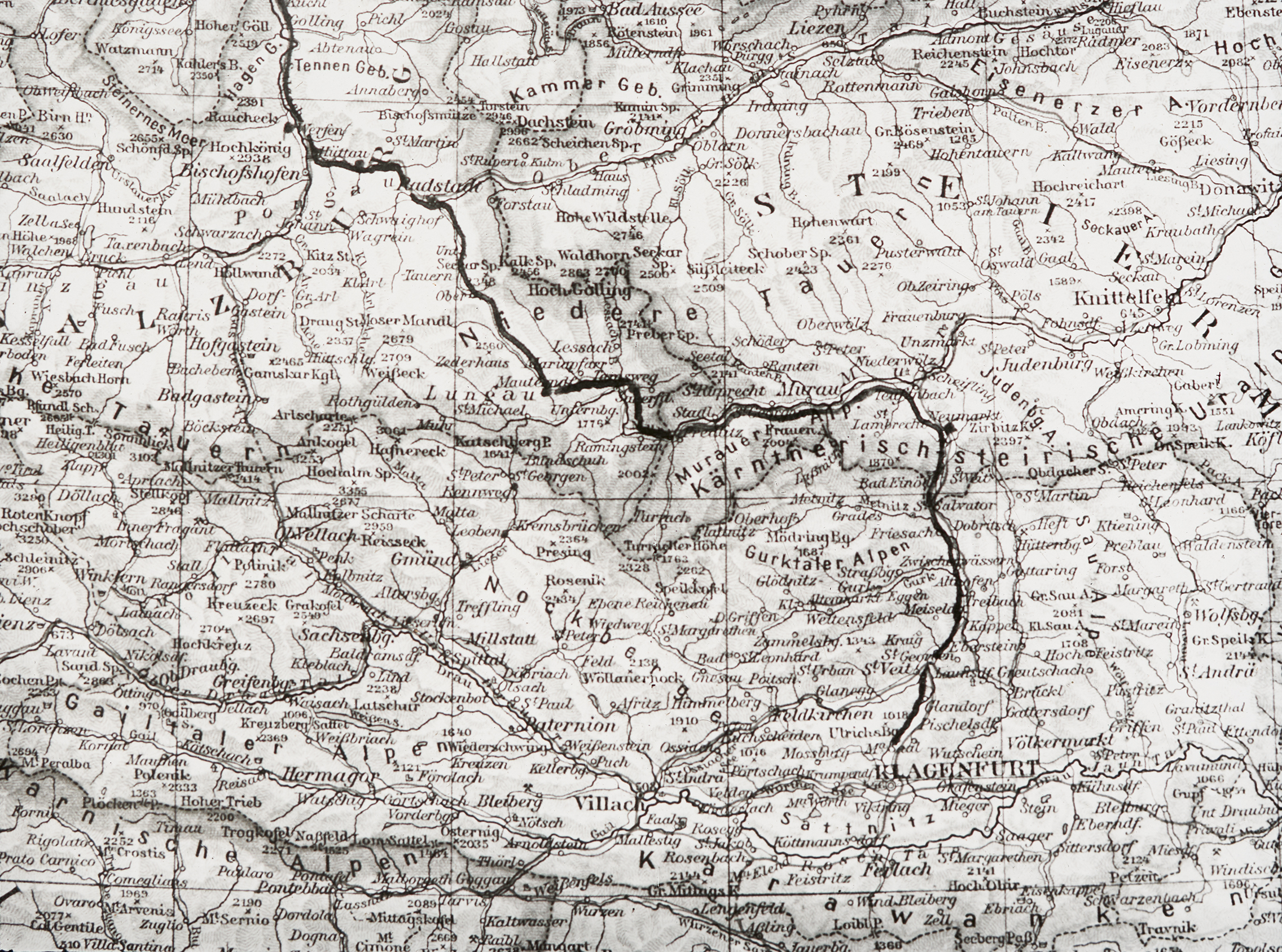 Der Ausschnitt einer Landkarte von Österreich. Man erkennt unter anderem die heutigen Bundesländer Kärnten, Salzburg und Steiermark.