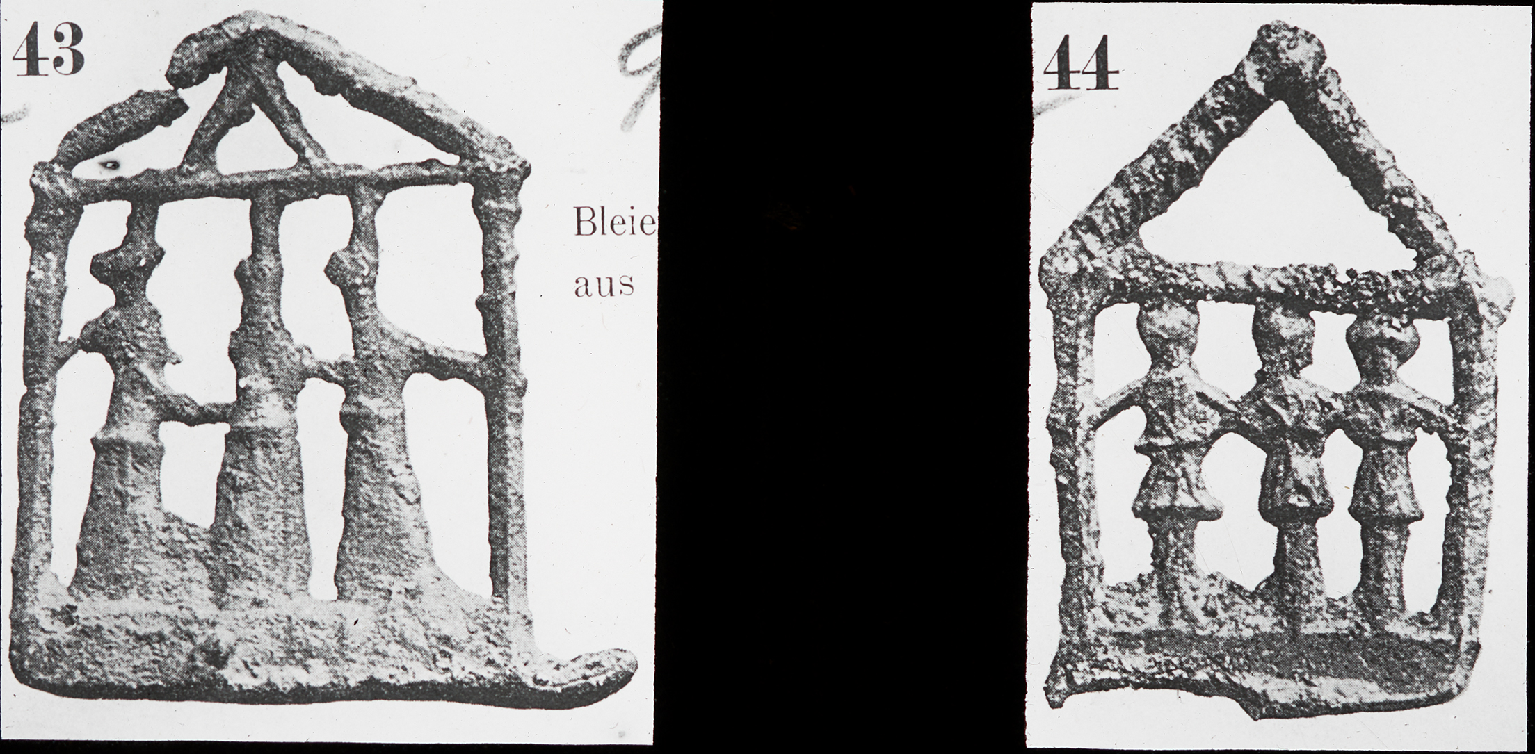 Zwei Bleifiguren. Diese beiden Figuren sind mit den Nummern 43 und 44 nummeriert.
