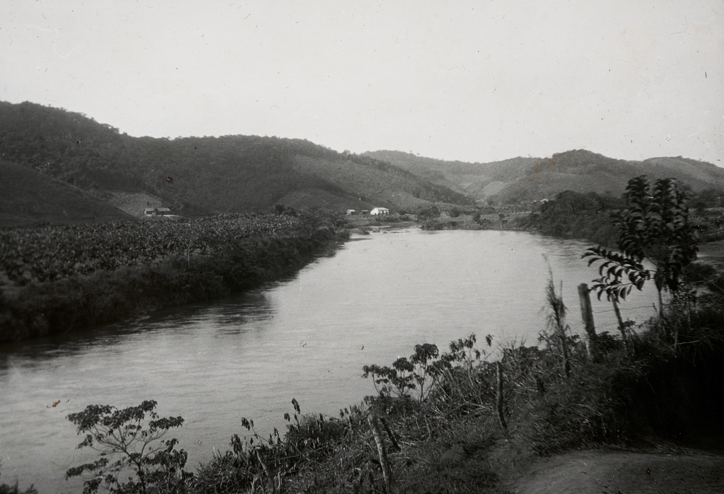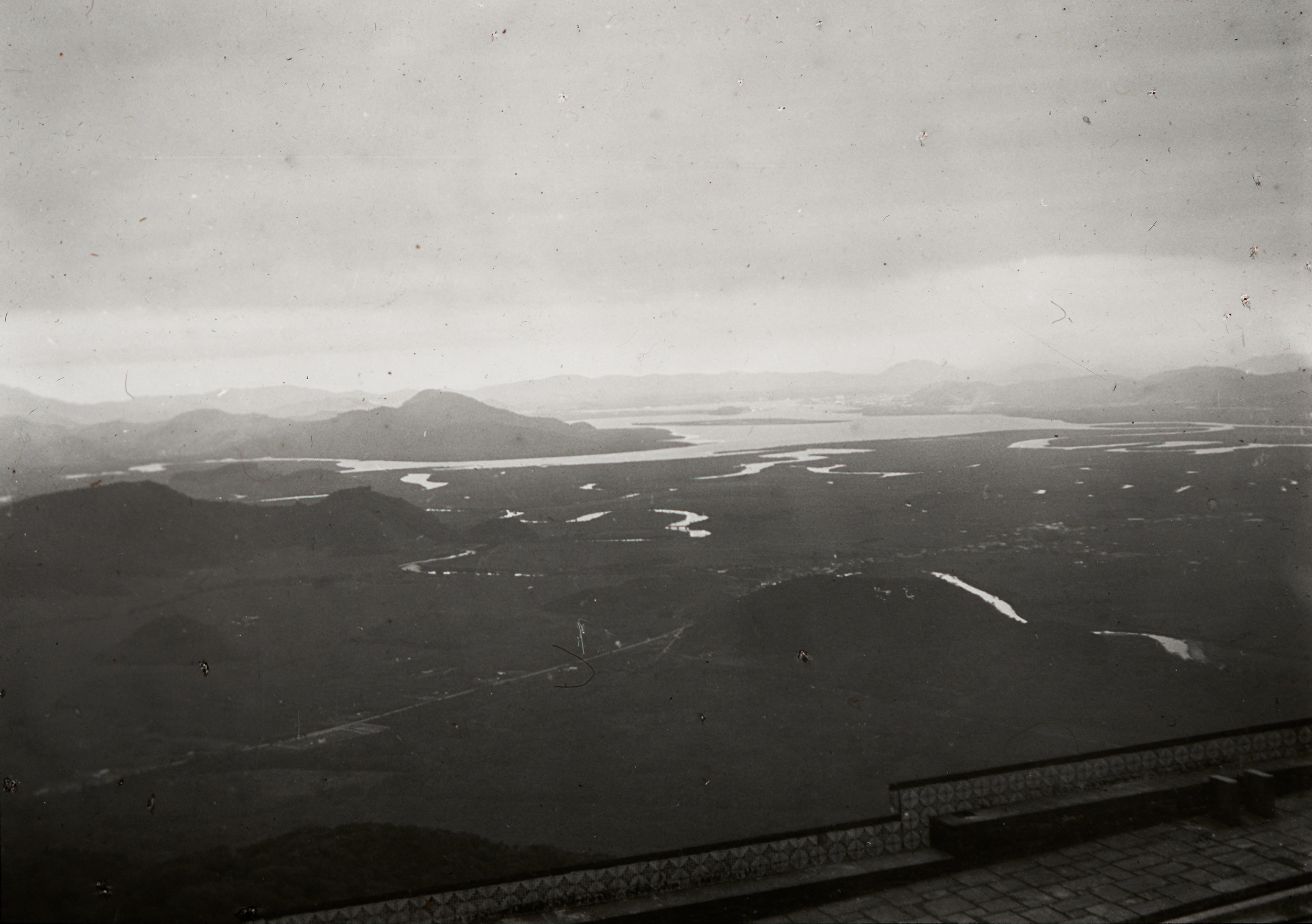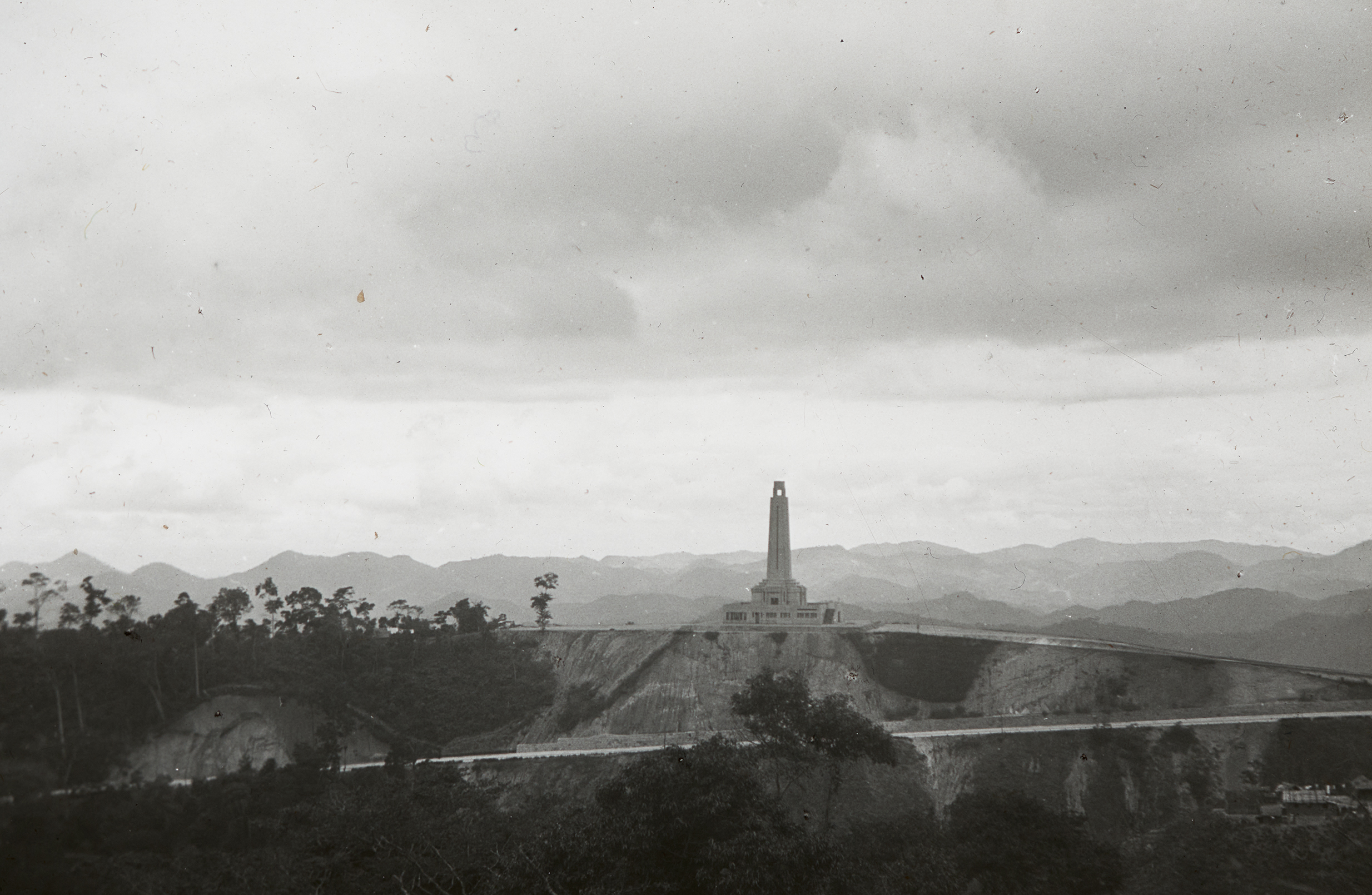 Der Ausblick über eine bergige Landschaft. Man erkennt ein großes Monument, das "Monumento Rodoviário". Es steht an der Autobahn zwischen Río de Janeiro und São Paulo. 1938 wurde das Denkmal fertiggestellt und eröffnet.