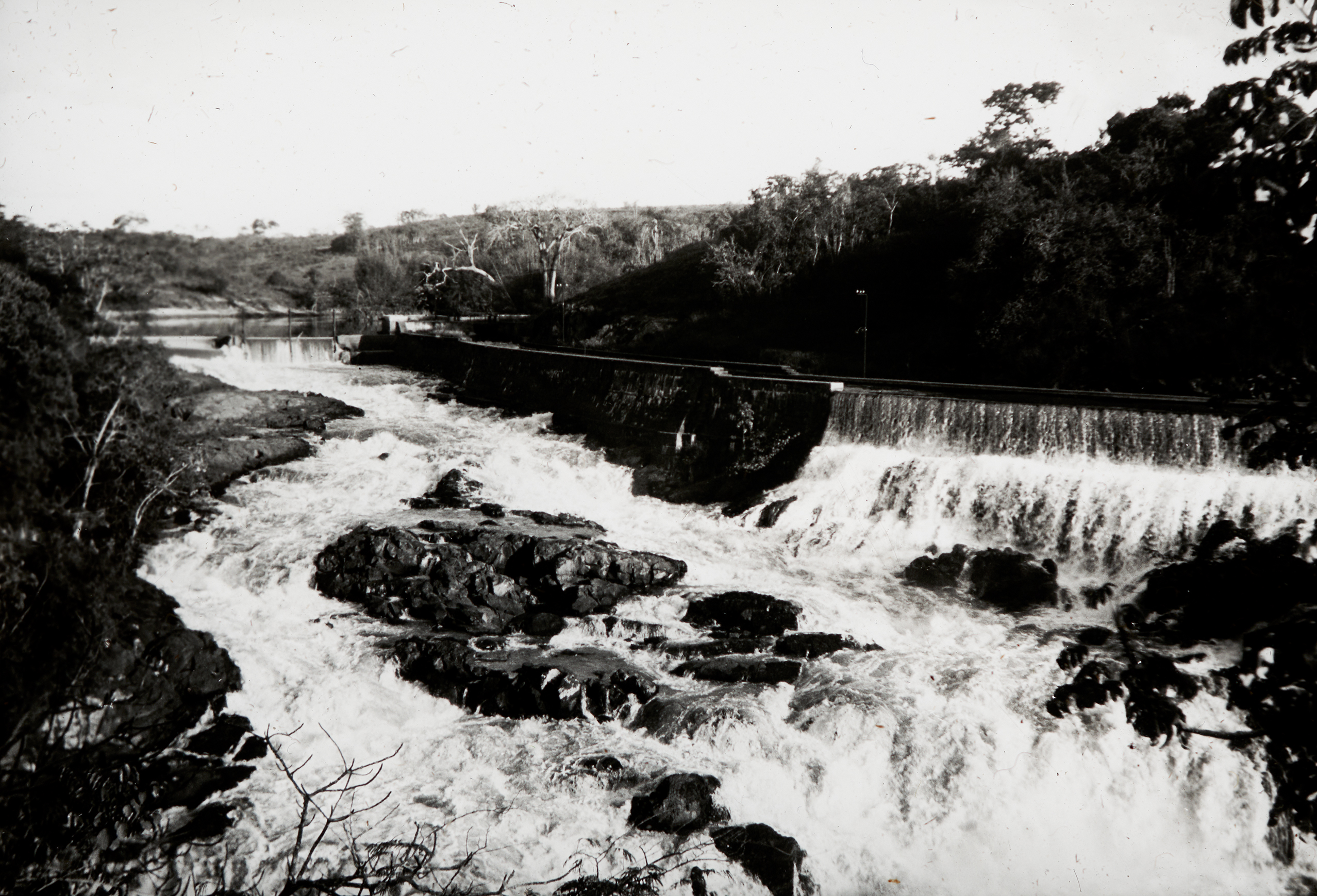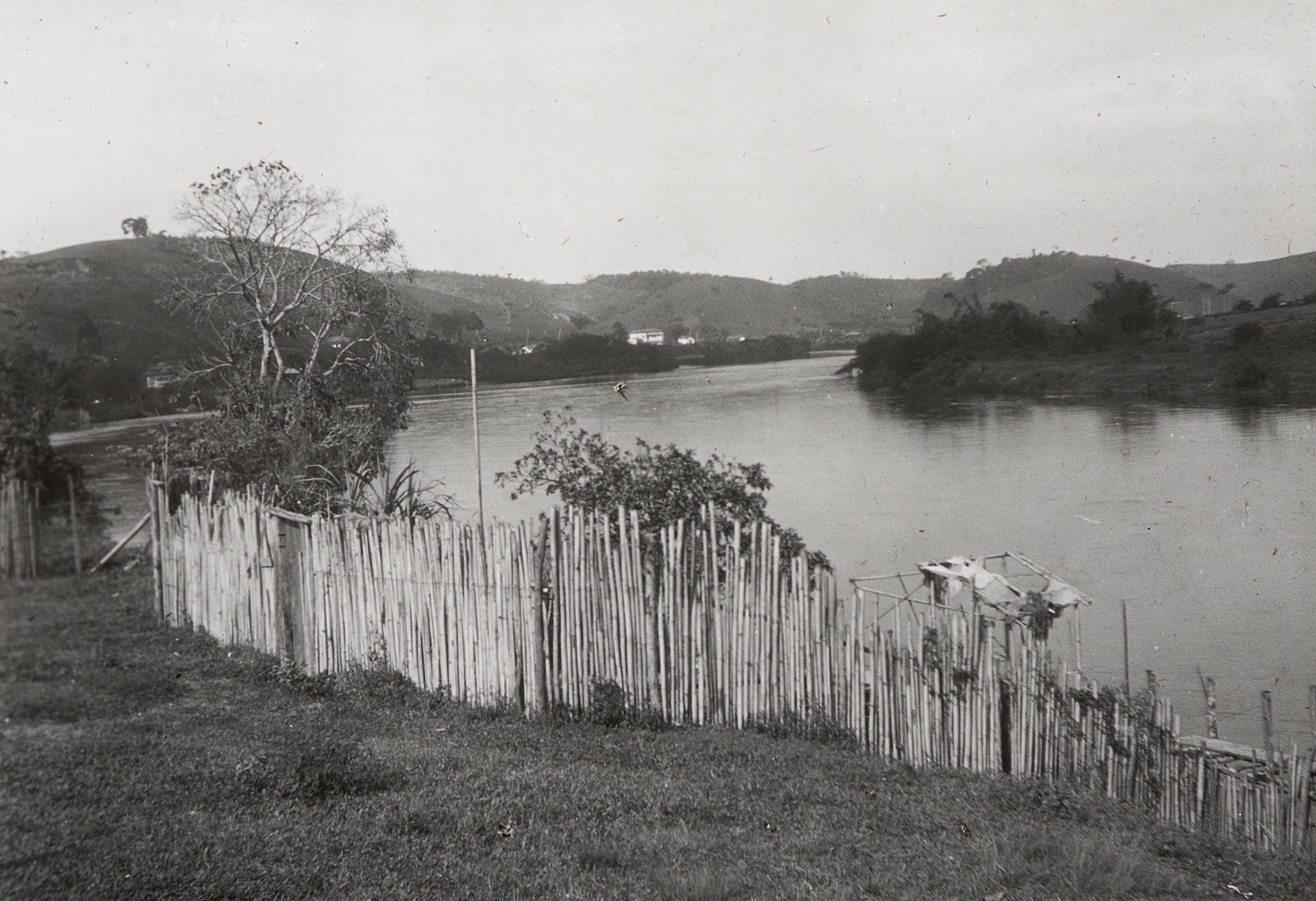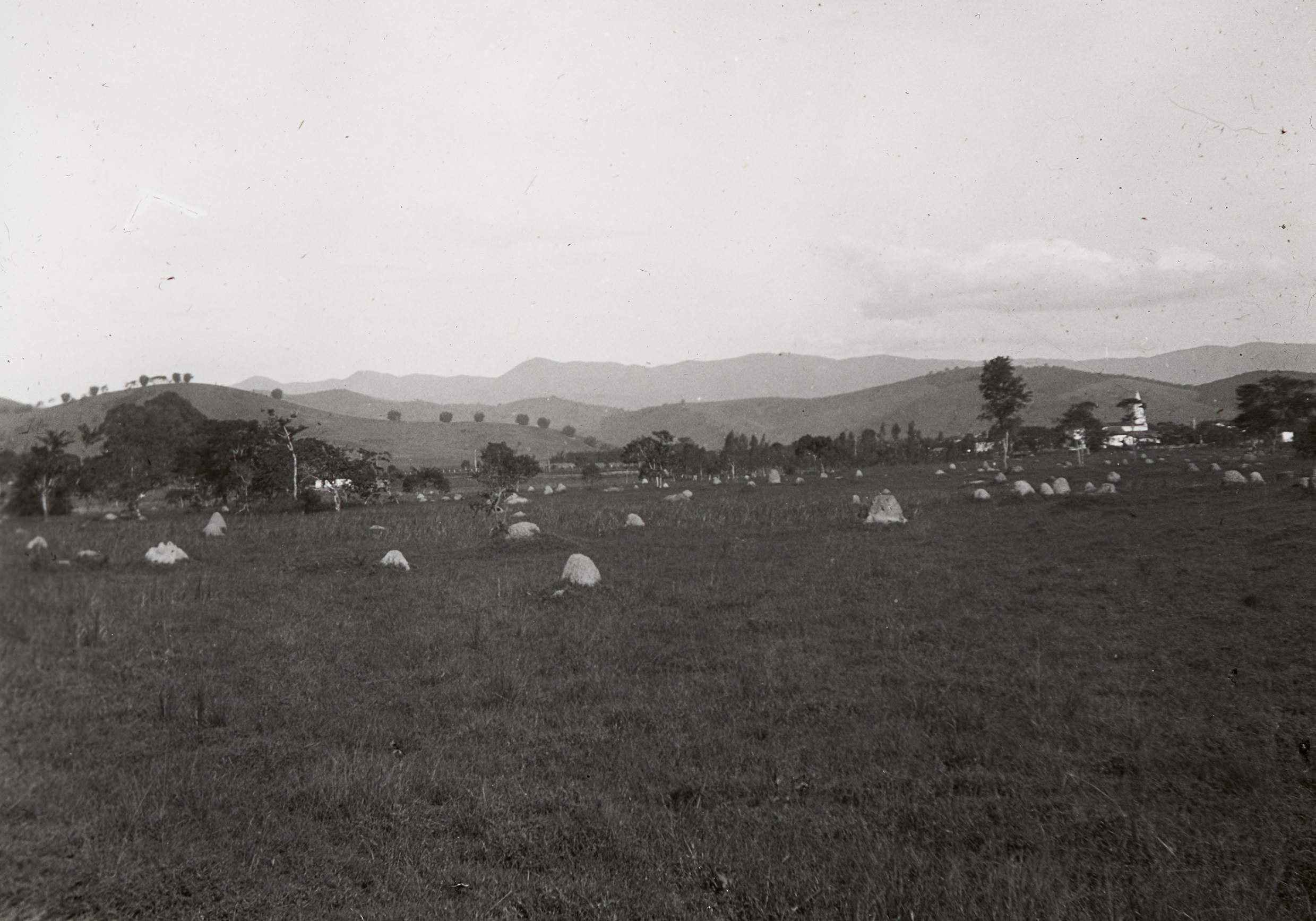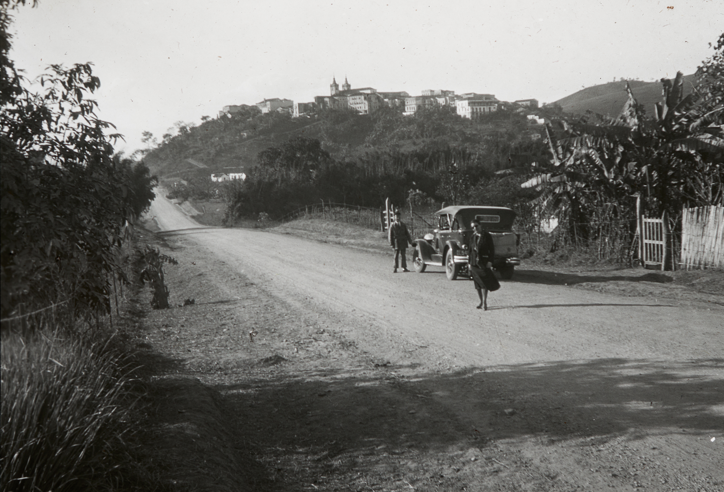 Der Ausblick über eine bergige Landschaft. Man erkennt ein großes Monument, das "Monumento Rodoviário". Es steht an der Autobahn zwischen Río de Janeiro und São Paulo. 1938 wurde das Denkmal fertiggestellt und eröffnet.
